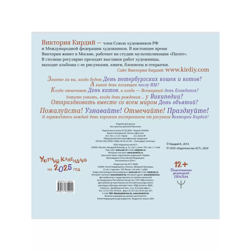 Этот календарь чудесный подарок близкому человеку или себе любимой! Яркие иллюстрации не только украсят интерьер, но и поднимут настроение в самый хмурый день. А большие окошки с числами вместят любые ваши отметки и не дадут вам забыть о важной дате или пропустить праздничный день. И знаете, сколько в 2025 году поводов для радости и улыбок? Ровно 365! Потому что каждый день будет приносить новые возможности и яркие события в вашу жизнь! И все 365 дней с вами будут солнечные и теплые картины Виктории Кирдий самой настоящей волшебницы, колдующей хорошее настроение изо дня в день! А еще в этом году будет много-много больших и маленьких праздников, да таких, о которых вы и не догадываетесь! Знаете ли вы, когда будет День петербургских кошек и котов? А какой день посвящен числу пи? Когда отмечают День китов, а когда Всемирный день блондинок? Хотите узнать, когда день рождения у Википедии? Отпраздновать вместе со всем миром День объятий? Пожалуйста! Узнавайте! Отмечайте! Празднуйте!