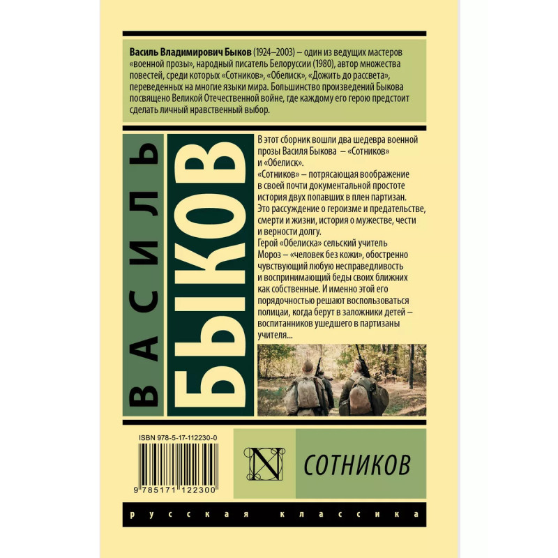 В этот сборник вошли два шедевра военной прозы Василя Быкова "Сотников" и "Обелиск". "Сотников" потрясающая воображение в своей почти документальной простоте история двух попавших в плен партизан. Это рассуждение о героизме и предательстве, смерти и жизни, история о мужестве, чести и верности долгу. Герой "Обелиска", сельский учитель Мороз "человек без кожи", обостренно чувствующий любую несправедливость и воспринимающий беды своих ближних как собственные. И именно этой его порядочностью решают воспользоваться полицаи, когда берут в заложники детей воспитанников ушедшего в партизаны учителя