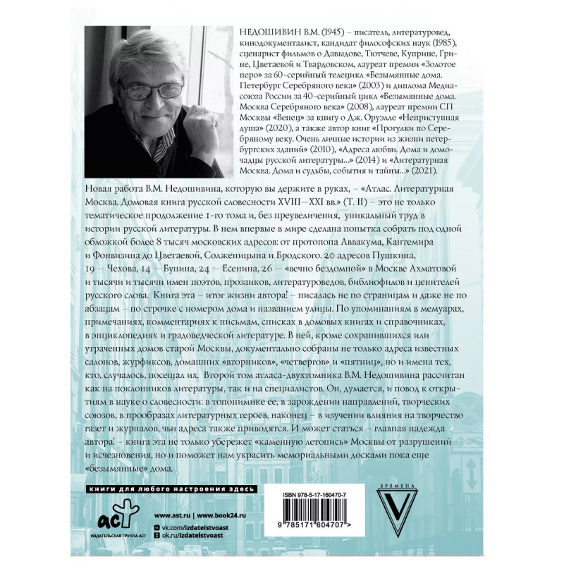Атлас. Литературная Москва. Домовая книга русской словесности, или 8000 адресов прозаиков, поэтов и . НЕДОШИВИН В.М. (1945) - писатель, литературовед, кинодокументалист, кандидат философских наук (1985), сценарист фильмов о Давыдове, Тютчеве, Куприне, Грине, Цветаевой и Твардовском, лауреат премии "Золотое перо" за 60-серийный телецикл "Безымянные дома. Петербург Серебряного века" (2003) и диплома Медиа союза России за 40-серийный цикл "Безымянные дома. Москва Серебряного века" (2008), лауреат премии СП Москвы "Венец" за книгу о Дж. Оруэлле "Неприступная душа" (2020), а также автор книг "Прогулки по Серебряному веку. Очень личные истории из жизни петербургских зданий" (2010), "Адреса любви. Дома и домочадцы русской литературы " (2014) и "Литературная Москва. Дома и судьбы, события и тайны " (2021). Новая работа В.М. Недошивина, которую вы держите в руках, - "Атлас. Литературная Москва. Домовая книга русской словесности XVIII-XXI вв." (Т. II) - это не только тематическое продолжение 1-го тома и, без преувеличения, уникальный труд в истории русской литературы. В нем впервые в мире сделана попытка собрать под од