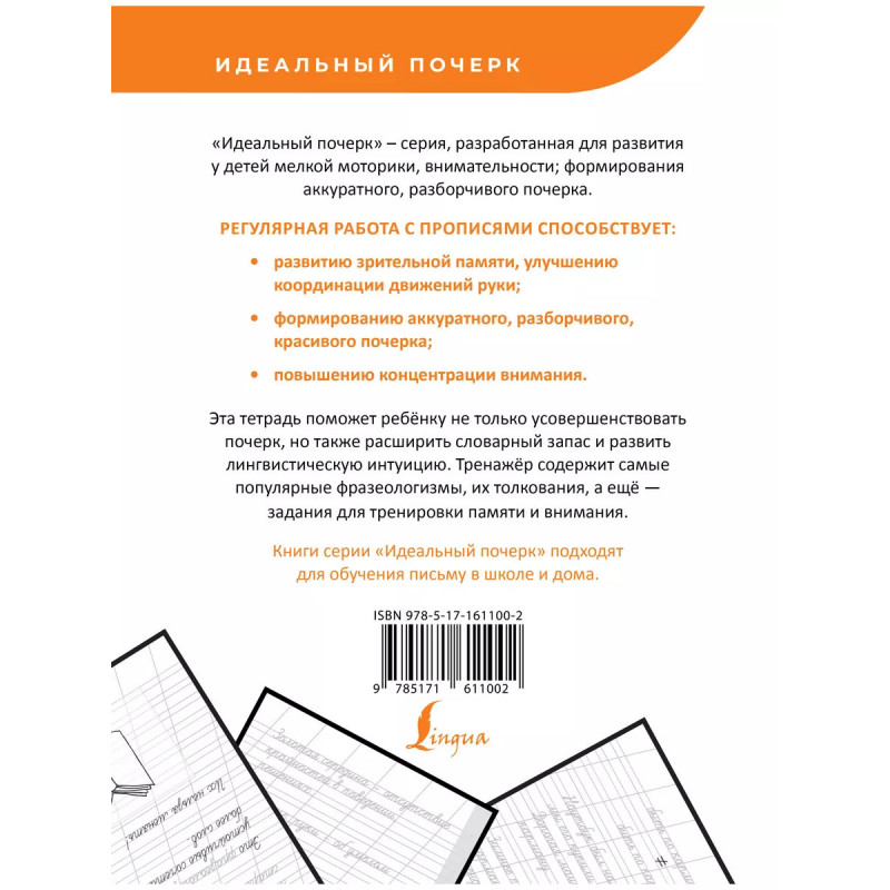 Русский язык. Фразеологизмы. Учимся писать красиво. Эти прописи познакомят ребёнка с самыми ходовыми фразеологизмами и станут отличным тренажёром разборчивого, красивого почерка. Текст напечатан "полупрозрачным" серым шрифтом. Обводя слова, ребёнок совершенствует почерк и доводит до автоматизма написание букв. Лексика, приведённая в издании, обогатит словарный запас школьника. Кроме того, в пособие включены задания, которые позволят развить лингвистическую интуицию, память и нестандартное мышление. Прописи предназначены для учащихся в начальной школе и соответствуют требованиям ФГОС (Федерального государственного образовательного стандарта).