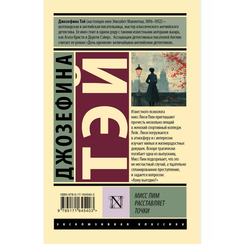 Джозефина Тэй одна из наиболее известных писательниц Золотого века британского детектива. И пусть ее новые романы выходили не с такой регулярностью, как работы ее более плодовитых коллег, выход каждой ее книг становился обсуждаемым событием, а среди поклонников творчества Тэй были Агата Кристи и Уинстон Черчилль. И хотя наибольшей популярностью пользовались романы Тэй из цикла об инспекторе Алане Гранте, любимой героиней самой писательницы стала мисс Пим. Известного психолога мисс Люси Пим приглашают прочесть курс лекций в женском спортивном колледже. Когда она из выпускниц погибает при трагических обстоятельствах, мисс Пим приходит к выводу, что это был не несчастный случай, а тщательно спланированное убийство. Но кому оно было выгодно?