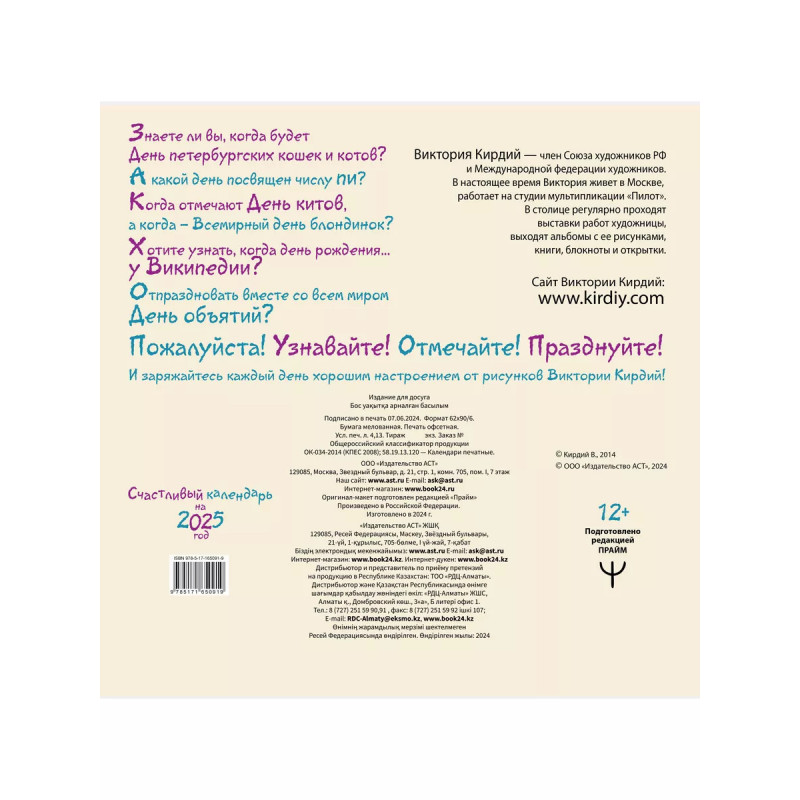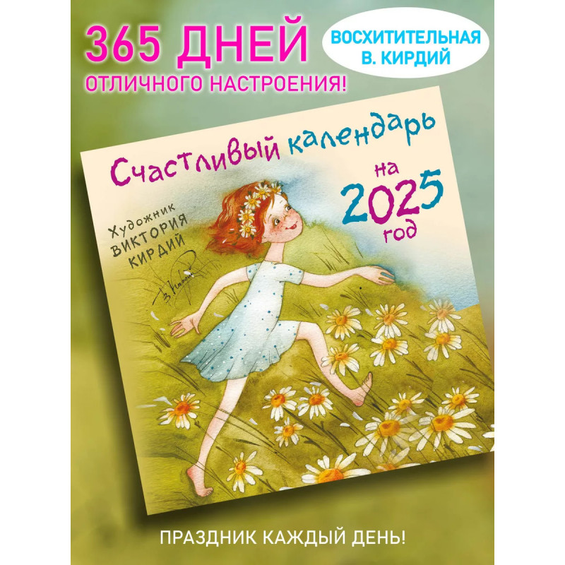 Этот календарь чудесный подарок близкому человеку или себе любимой! Яркие иллюстрации не только украсят интерьер, но и поднимут настроение в самый хмурый день. А большие окошки с числами вместят любые ваши отметки и не дадут вам забыть о важной дате или пропустить праздничный день. И знаете, сколько в 2025 году поводов для радости и улыбок? Ровно 365! Потому что каждый день будет приносить новые возможности и яркие события в вашу жизнь! И все 365 дней с вами будут солнечные и теплые картины Виктории Кирдий самой настоящей волшебницы, колдующей хорошее настроение изо дня в день! А еще в этом году будет много-много больших и маленьких праздников, да таких, о которых вы и не догадываетесь! Знаете ли вы, когда будет День петербургских кошек и котов? А какой день посвящен числу пи? Когда отмечают День китов, а когда Всемирный день блондинок? Хотите узнать, когда день рождения у Википедии? Отпраздновать вместе со всем миром День объятий? Пожалуйста! Узнавайте! Отмечайте! Празднуйте!