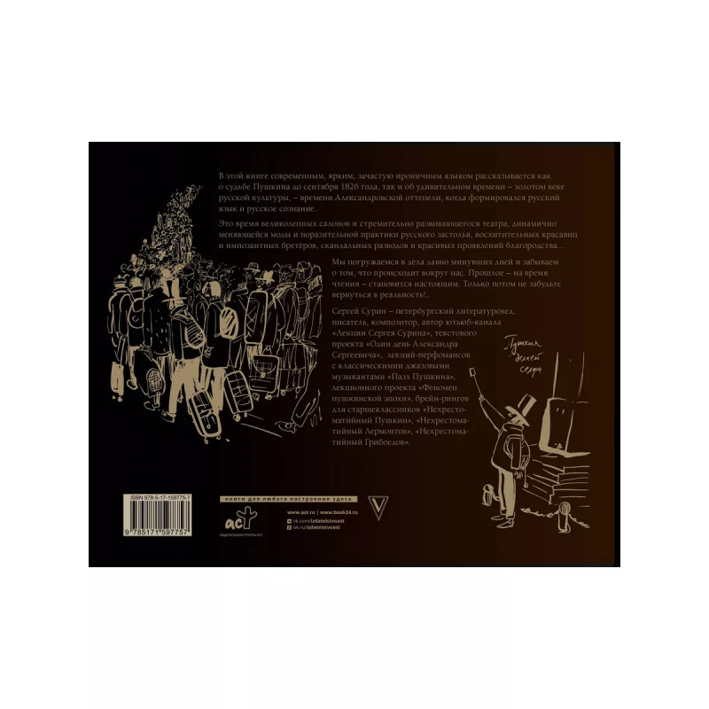 Сергей Сурин петербургский литературовед, писатель, композитор, автор ютьюб-канала "Лекции Сергея Сурина", текстового проекта "Один день Александра Сергеевича", лекций-перфомансов с классическими и джазовыми музыкантами "Пазл Пушкина", лекционного проекта "Феномен пушкинской эпохи", брейн-рингов для старшеклассников "Нехрестоматийный Пушкин", "Нехрестоматийный Лермонтов", "Нехрестоматийный Грибоедов". В этой книге современным, ярким, зачастую ироничным языком рассказывается как о судьбе Пушкина до сентября 1826 года, так и об удивительном времени золотом веке русской культуры, времени Александровской оттепели, когда формировался русский язык и русское сознание. Это время великолепных салонов и стремительно развивающегося театра, динамично меняющейся моды и поразительной практики русского застолья, восхитительных красавиц и импозантных бретёров, скандальных разводов и красивых проявлений благородства