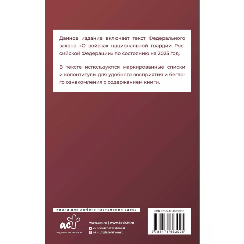 Данное издание включает текст Федерального закона "О войсках национальной гвардии Российской Федерации" на 2025 год. В тексте используются маркированные списки и колонтитулы для удобного восприятия и беглого ознакомления с содержанием книги. Издание учитывает все изменения, опубликованные в официальных источниках на момент подписания издания в печать.