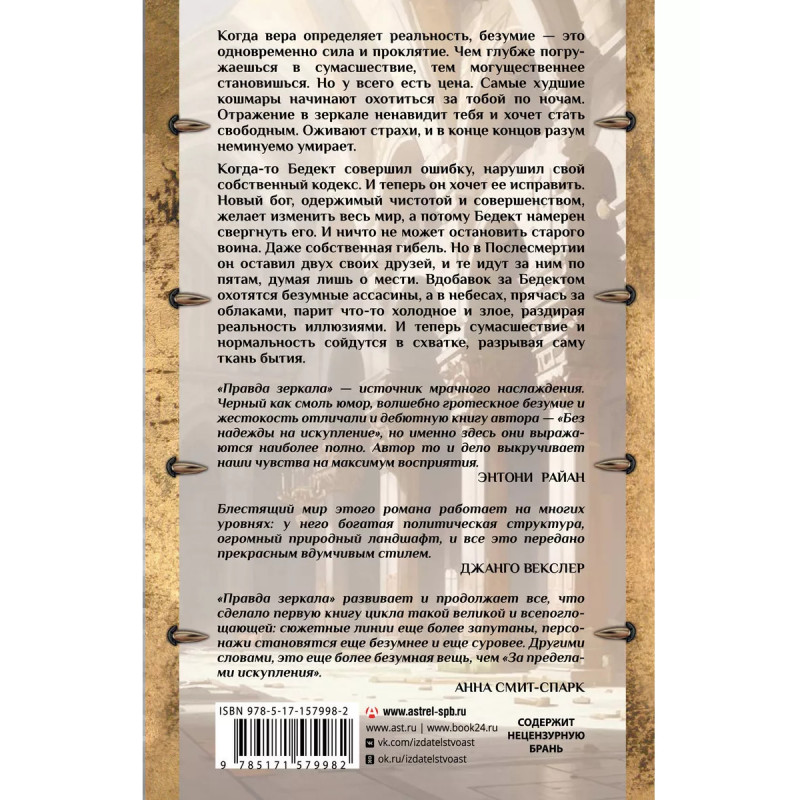 Когда вера определяет реальность, безумие это одновременно сила и проклятие. Чем глубже погружаешься в сумасшествие, тем могущественнее становишься. Но у всего есть цена. Самые худшие кошмары начинают охотиться за тобой по ночам. Отражение в зеркале ненавидит тебя и хочет стать свободным. Оживают страхи, и в конце концов разум неминуемо умирает. Когда-то Бедект совершил ошибку, нарушил свой собственный кодекс. И теперь он хочет ее исправить. Новый бог, одержимый чистотой и совершенством, желает изменить весь мир, а потому Бедект намерен свергнуть его. И ничто не может остановить старого воина. Даже собственная гибель. Но в Послесмертии он оставил двух своих друзей, и те идут за ним по пятам, думая лишь о мести. Вдобавок за Бедектом охотятся безумные ассасины, а в небесах, прячась за облаками, парит что-то холодное и злое, раздирая реальность иллюзиями. И теперь сумасшествие и нормальность сойдутся в схватке, разрывая саму ткань бытия.