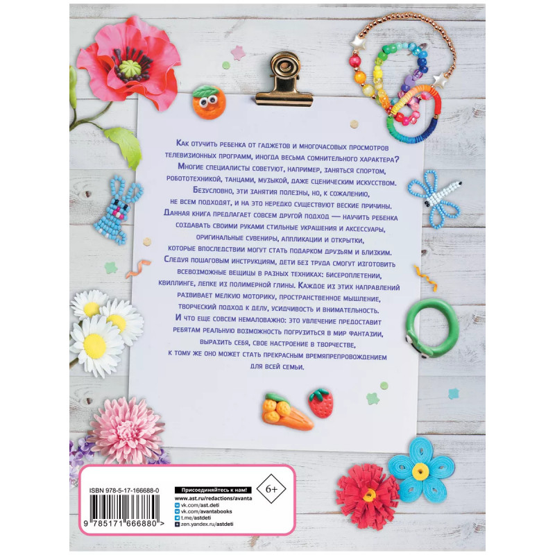 Стильные украшения, аксессуары, сувениры, аппликации, открытки все это вы можете сделать своими руками, следуя пошаговым инструкциям, размещенным на страницах этой книги. Она предоставит вам замечательную возможность погрузиться в мир фантазии и выразить себя, свое настроение в реальном деле изготовлении модных изделий в разных техниках. Бисероплетение, квиллинг, лепка из полимерной глины развивают мелкую моторику, простран- ственное мышление, творческий подход к делу, усидчивость и внимательность. Это увлечение может стать прекрасным времяпровождением не только для вас, но и для всей семьи. Для среднего школьного возраста.