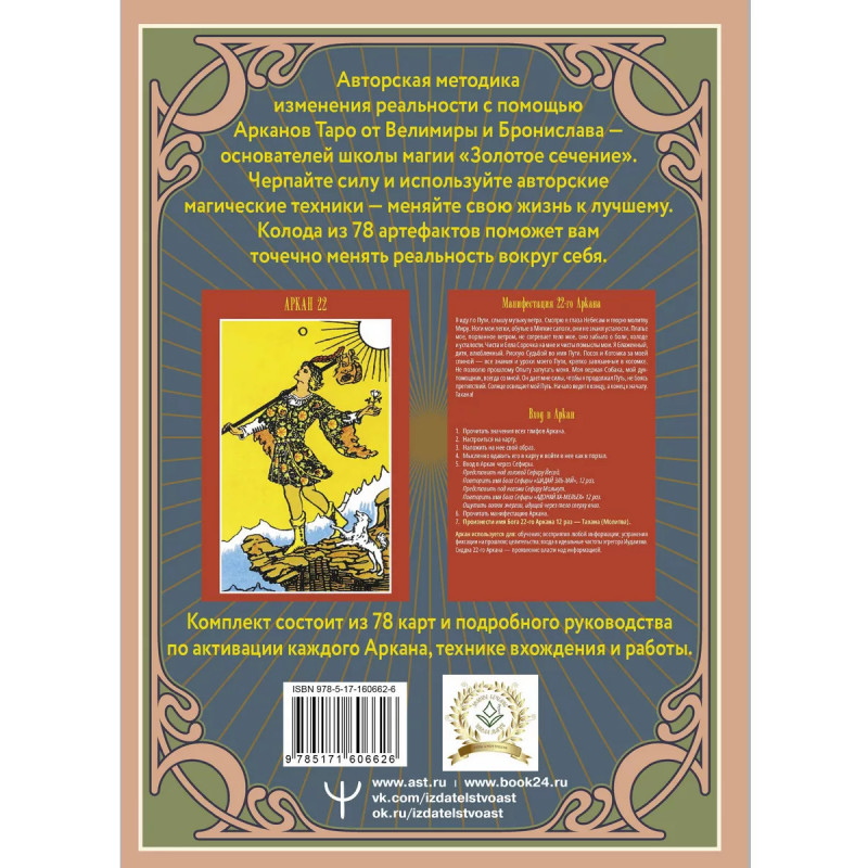 Велимира и Бронислав основатели школы магии "Золотое сечение", признанные мастера эзотерических практик представляют новый магический инструмент для изменения реальности. Каждый Аркан Таро содержит символический ключ, при активации которого открывается портал к магическому первоисточнику. Черпайте силу и используйте авторские магические техники меняйте свою жизнь к лучшему. Решайте финансовые проблемы, усиливайте свои таланты, налаживайте отношения 78 артефактов помогут вам точечно менять реальность вокруг себя. Прикоснитесь к Хроникам Акаши и станьте настоящим магом! Большой вариант "Таро Ключи Акаши. Карты-порталы. Используй энергию Арканов, чтобы изменить свою жизнь". В комплекте: колода из 78 карт Артура Уэйта, подробное руководство по активации, манифестации, вхождению в Аркан и работе по изменению реальности.