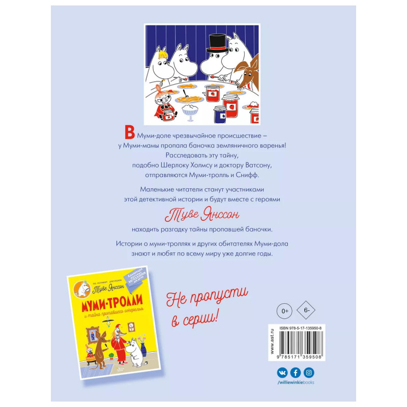 В Муми-доле чрезвычайное происшествие - у Муми-мамы пропала баночка земляничного варенья! Расследовать эту тайну, подобно Шерлоку Холмсу и доктору Ватсону, отправляются Муми-тролль и Снифф. Маленькие читатели станут участниками этой детективной истории и будут вместе с героями Туве Янссон находить разгадки тайны пропажи баночки варенья. Для детей до 3-х лет.