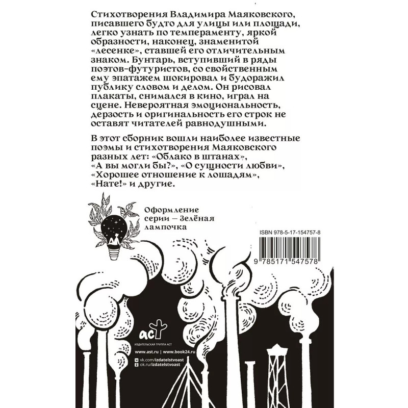 Кто там шагает правой?. Стихотворения Владимира Маяковского, писавшего будто для улицы или площади, легко узнать по темпераменту, яркой образности, наконец, знаменитой "лесенке", ставшей его отличительным знаком. Бунтарь, вступивший в ряды поэтов-футуристов, со свойственным ему эпатажем шокировал и будоражил публику словом и делом. Он рисовал плакаты, снимался в кино, играл на сцене. Невероятная эмоциональность, дерзость и оригинальность его строк не оставят читателей равнодушными. В этот сборник вошли наиболее известные поэмы и стихотворения Маяковского разных лет: "Облако в штанах", "А вы могли бы?", "О сущности любви", "Хорошее отношение к лошадям", "Нате!" и другие.