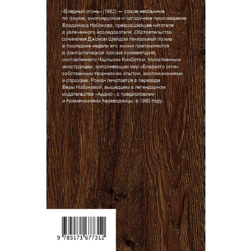 "Бледный огонь" (1962) самое необычное по форме произведение Владимира Набокова, состоящее из эпиграфа, одноименной поэмы в 999 строк, предисловия к ней, обширного комментария и указателя. Обстоятельства сочинения Джоном Шейдом гениальной поэмы в последние недели его жизни преломляются в фантастической призме комментария, составленного загадочным и одиноким поклонником американского поэта Чарльзом Кинботом, наполняющим мир "Бледного огня" собственным творческим опытом, воспоминаниями и страхами. В настоящем издании роман печатается в переводе Веры Набоковой.