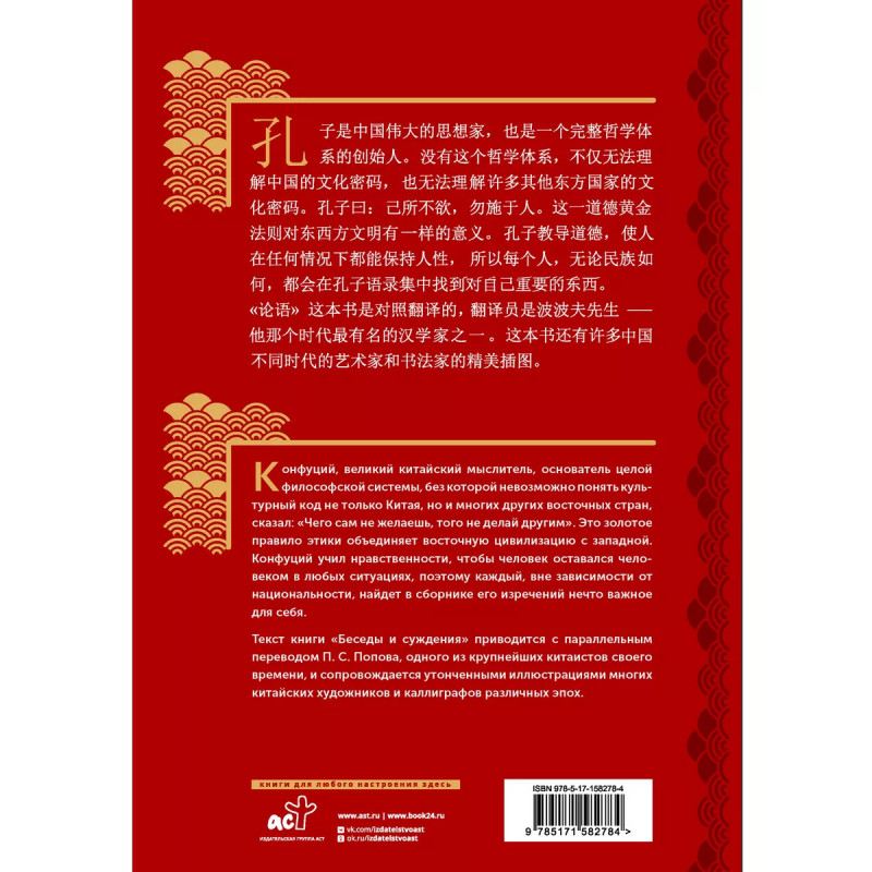 Беседы и суждения ln y. Конфуций, великий китайский мыслитель, основатель целой философской системы, без которой невозможно понять культурный код не только Китая, но и многих других восточных стран, сказал: "Чего сам не желаешь, того не делай другим". Это золотое правило этики объединяет Восточную цивилизацию с Западной. Конфуций учил нравственности, чтобы человек оставался человеком в любых ситуациях, поэтому каждый вне зависимости от национальности найдет в сборнике его изречений нечто важное для себя. Текст книги "Беседы и рассуждения" приводится с параллельным переводом Павла Степановича Попова, одного из крупнейших китаистов своего времени, переводчика, приват-доцента кафедры китайской словесности на факультете восточных языков Петербургского университета. Для погружения в пронизанный созерцательностью перевод сопровождается утонченными иллюстрациями многих китайских художников и каллиграфов различных эпох: Ду Сяна, Дун Цичана, Ван Цзяня, Дун Цичана, Лань Ина, Сяо Юньцуна. Кроме того, в макете использованы фрагменты картин Чжао