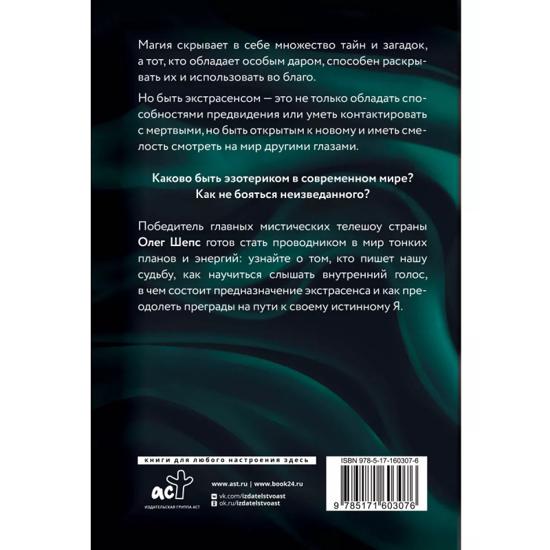 Магия скрывает в себе множество тайн и загадок, а тот, кто обладает особым даром, способен раскрывать их и использовать во благо. Но быть экстрасенсом это не только обладать способностями предвидения или уметь контактировать с мертвыми, но и быть открытым к новому и иметь смелость смотреть на мир другими глазами. Каково быть эзотериком в современном мире? Как не бояться неизведанного? Победитель главных мистических телешоу страны Олег Шепс готов стать проводником в мир тонких планов и энергий: узнайте о том, кто пишет нашу судьбу, как научиться слышать внутренний голос, в чем состоит предназначение экстрасенса и как преодолеть преграды на пути к своему истинному Я.