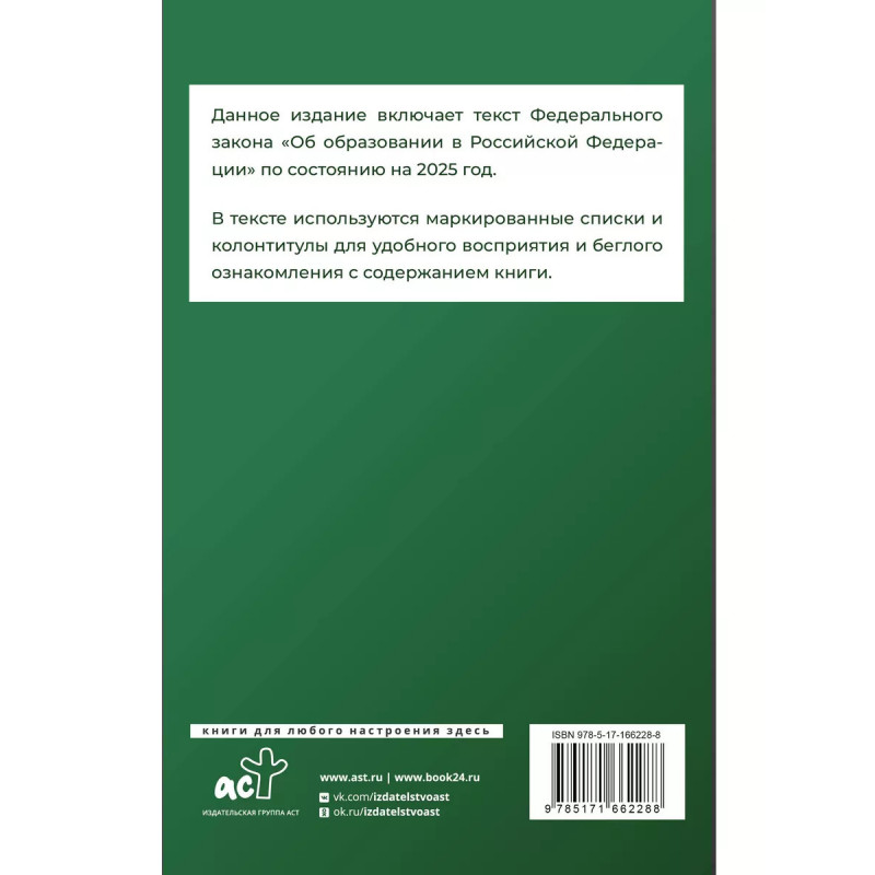 Данное издание включает текст Федерального закона "Об образовании в Российской Федерации" на 2025 год. В тексте используются маркированные списки и колонтитулы для удобного восприятия и беглого ознакомления с содержанием книги. Издание учитывает все изменения, опубликованные в официальных источниках на момент подписания издания в печать.