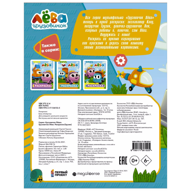 Новинка для фанатов мультсериала Грузовичок Лёва. Раскраска с любимыми персонажами Лёва, Капа, Грузик, Лея. Машинки-друзья не только веселятся и играют, но еще и совершают добрые дела и помогают друг другу. Лёва собирает машины и роботов и учит тебя азам техники. Раскрашивай любимых героев и веселись вместе с ними. А еще развивай логику, внимательность, конструкторское мышление и память.