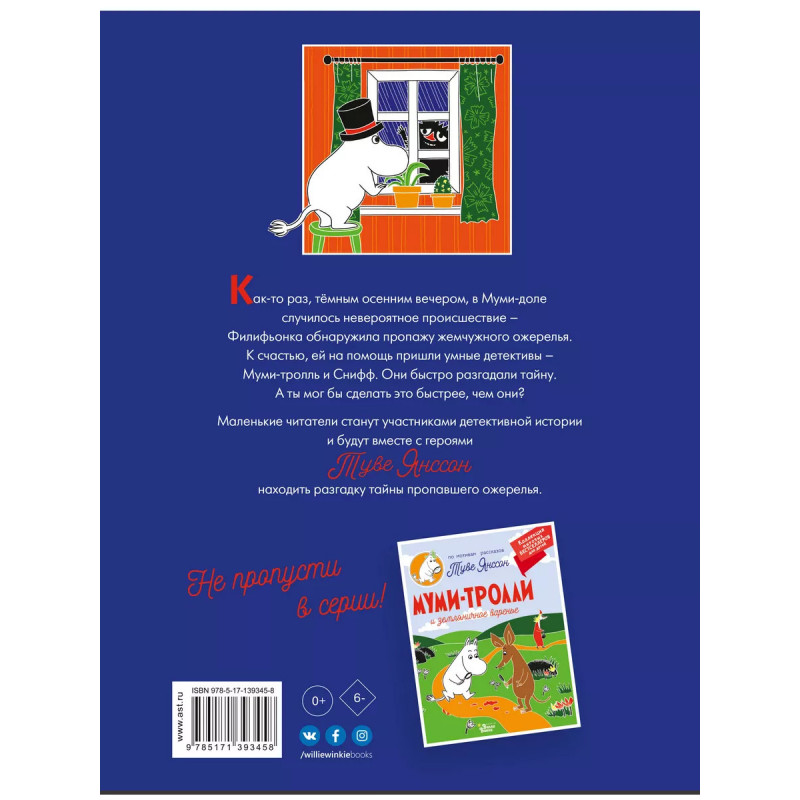 Как-то раз, тёмным осенним вечером, друзья муми-троллей собрались у них в доме. Внезапно Филифьонка обнаружила пропажу жемчужного ожерелья. К счастью, ей на помощь пришли умные детективы из Муми-дола Муми-тролль и Снифф. Они быстро разгадали тайну пропажи. А ты мог бы сделать это быстрее, чем они? Маленькие читатели станут участниками детективной истории и будут вместе с героями Туве Янссон раскрывать все тайны Муми-дола. Для детей до 3-х лет.