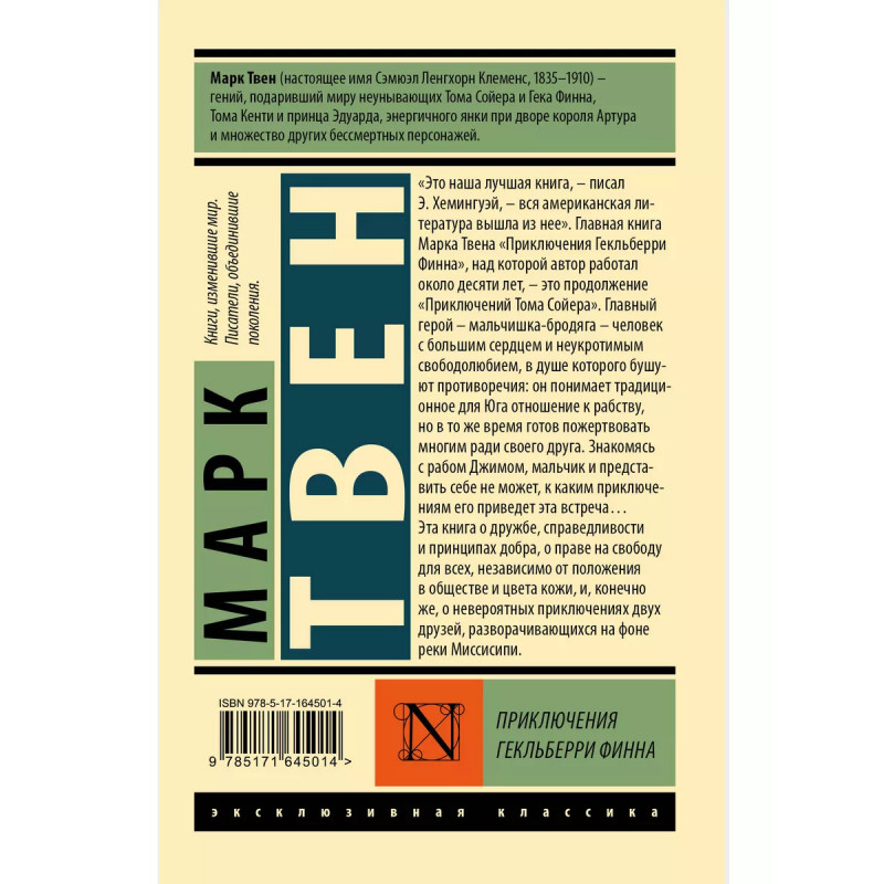 Приключения Гекльберри Финна книга, продолжающая историю Приключений Тома Сойера, над которой Марк Твен работал более десяти лет, произвела на общество гораздо большее влияние, чем её предшественница. На сегодняшний день Гек Финн входит в число Великих американских романов, а Эрнест Хемингуэй в свое время сказал, что именно из этой книги выросла вся американская литература. Главный герой книги Гекльберри Гек Финн, беспризорный сорванец и лучший друг Тома Сойера. В результате предыдущих похождений парочки каждый из мальчишек получает в свое распоряжение немаленькую сумму денег, а Гека берет на воспитание вдова Дуглас добрая, но набожная, благочестивая и невообразимо скучная дама. Но прежде чем Гек успевает сбежать от нее, мальчика похищает его родной отец, бродяга и пьяница, заинтересованный в новоиспеченном богатстве отпрыска. Но Геку удается сбежать от папаши и, заручившись компанией беглого раба Джима, отправиться в путешествие на плоту вниз по реке.