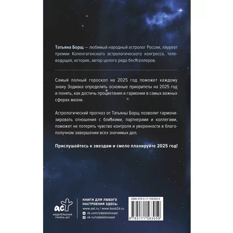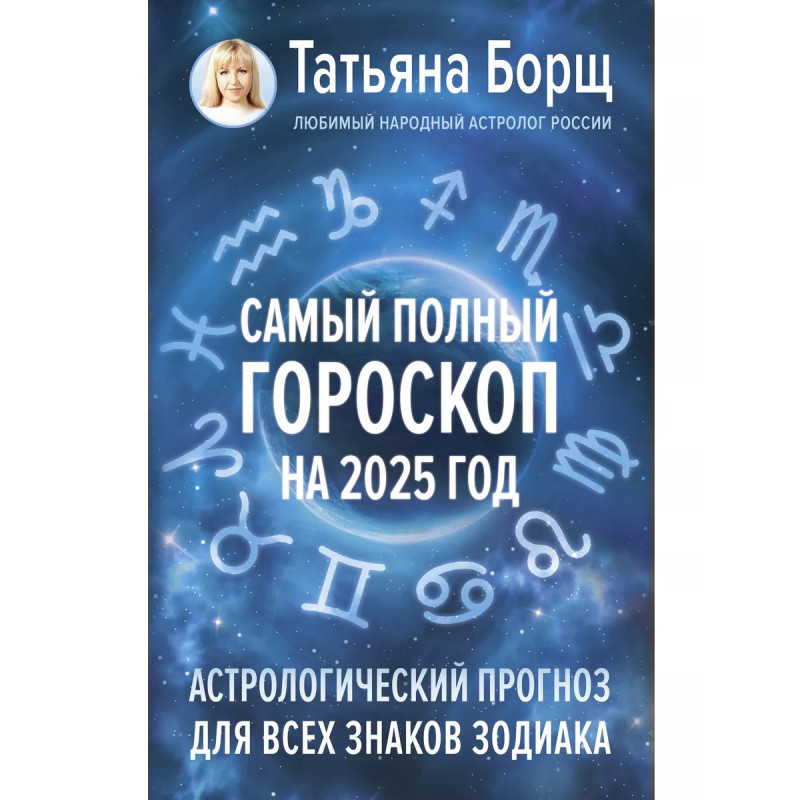 Татьяна Борщ любимый народный астролог России, лауреат премии Копенгагенского астрологического конгресса, телеведущая, историк, автор целого ряда бестселлеров. Самый полный гороскоп на 2025 год поможет каждому знаку Зодиака определить основные приоритеты на 2025 год и понять, как достичь процветания и гармонии в самых важных сферах жизни. Астрологический прогноз от Татьяны Борщ позволит гармонизировать отношения с близкими, партнерами и коллегами, поможет не потерять чувство контроля и уверенности в благополучном завершении всех значимых дел. Прислушайтесь к звездам и смело планируйте 2025 год!