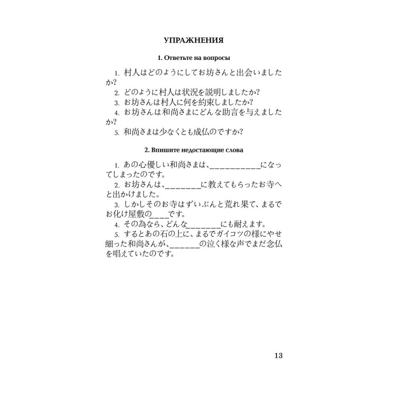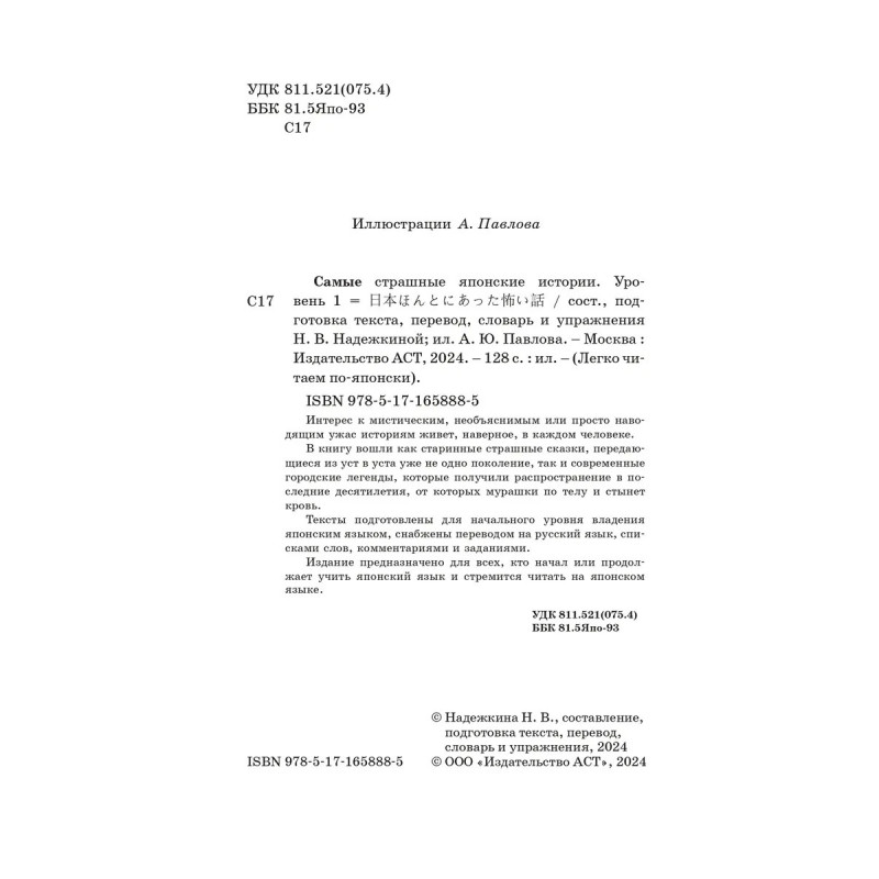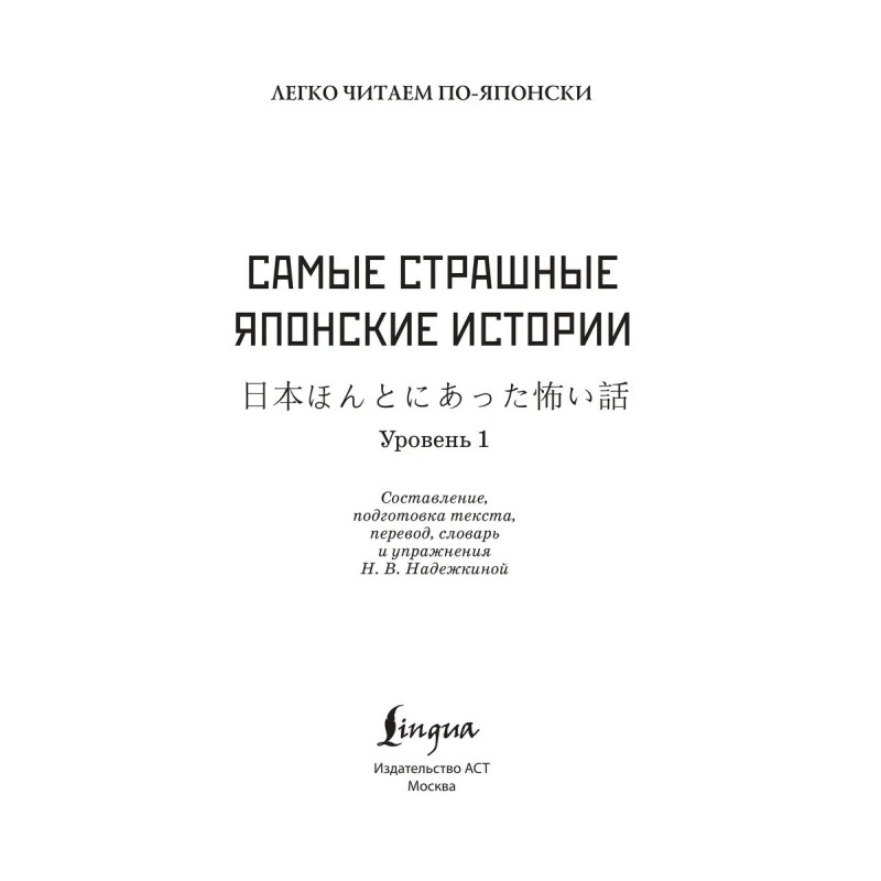 Интерес к мистическим, необъяснимым или просто наводящим ужас историям живет, наверное, в каждом человеке. В эту книгу вошли как старинные страшные сказки, передающиеся из уст в уста уже не одно поколение, так и современные городские легенды, которые получили распространение в последние десятилетия, от которых мурашки по телу и стынет кровь. Тексты подготовлены для начального уровня владения японским языком, снабжены переводом на русский язык, списками слов, комментариями и заданиями. Издание предназначено для всех, кто начал или продолжает учить японский язык.
