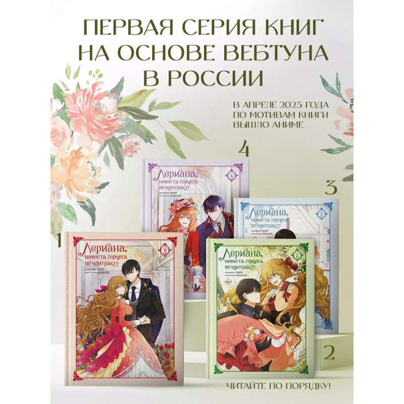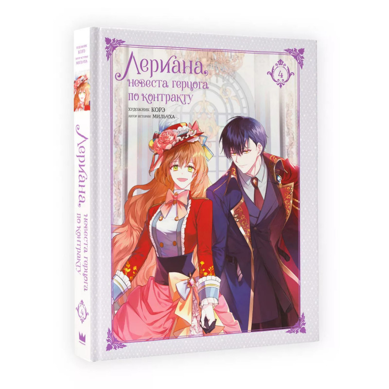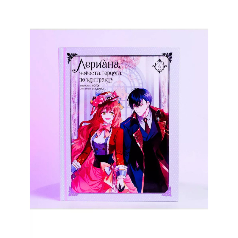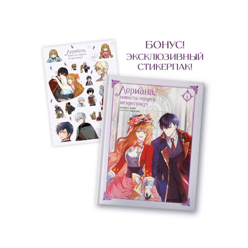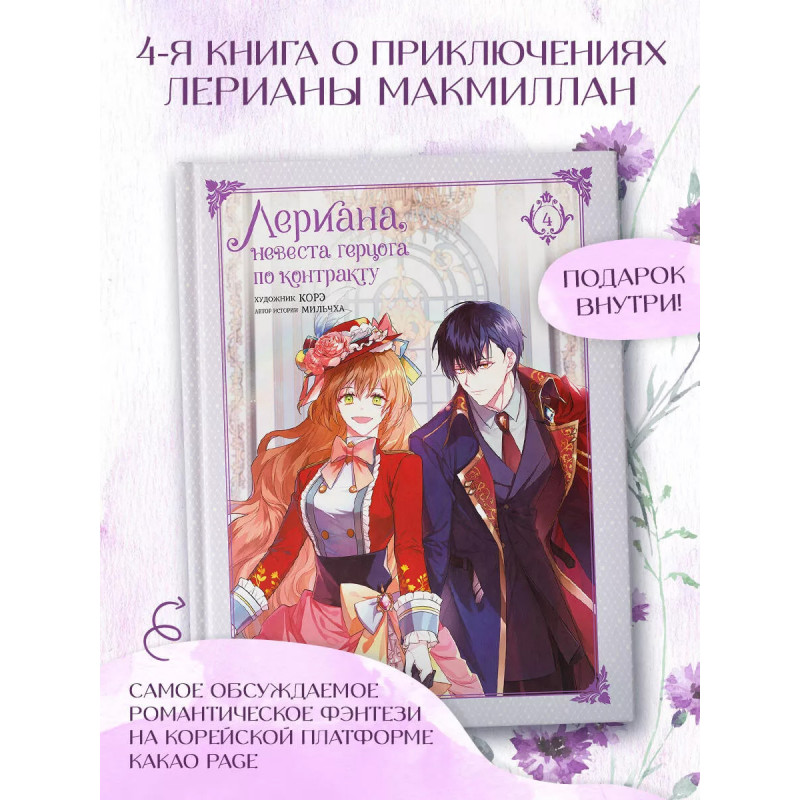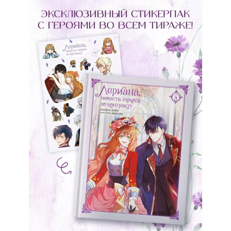 Лериана, невеста герцога по контракту. Том 4. " Четвертый том самого обсуждаемого романтического фэнтези на популярной корейской платформе Kakao Page! " Бонус! Эксклюзивный стикерпак внутри! " В апреле 2023 года по мотивам книги вышло аниме! Планируется выход 2-го сезона! " Идеальное сочетание захватывающего сюжета, интересных персонажей и красивых иллюстраций, оторваться невозможно! " Понравится поклонникам "Бриджертонов"!