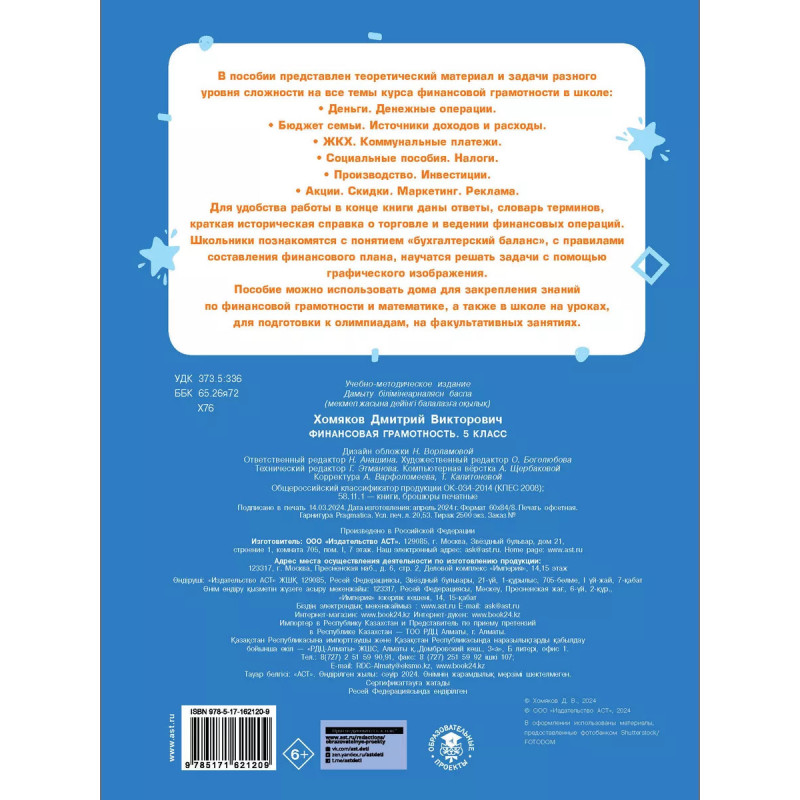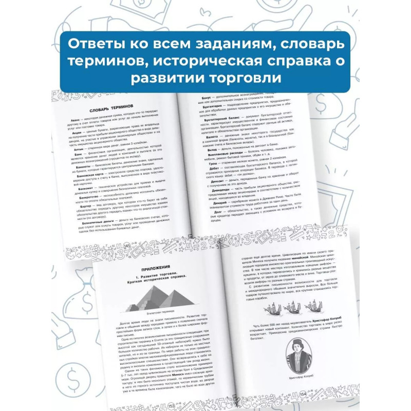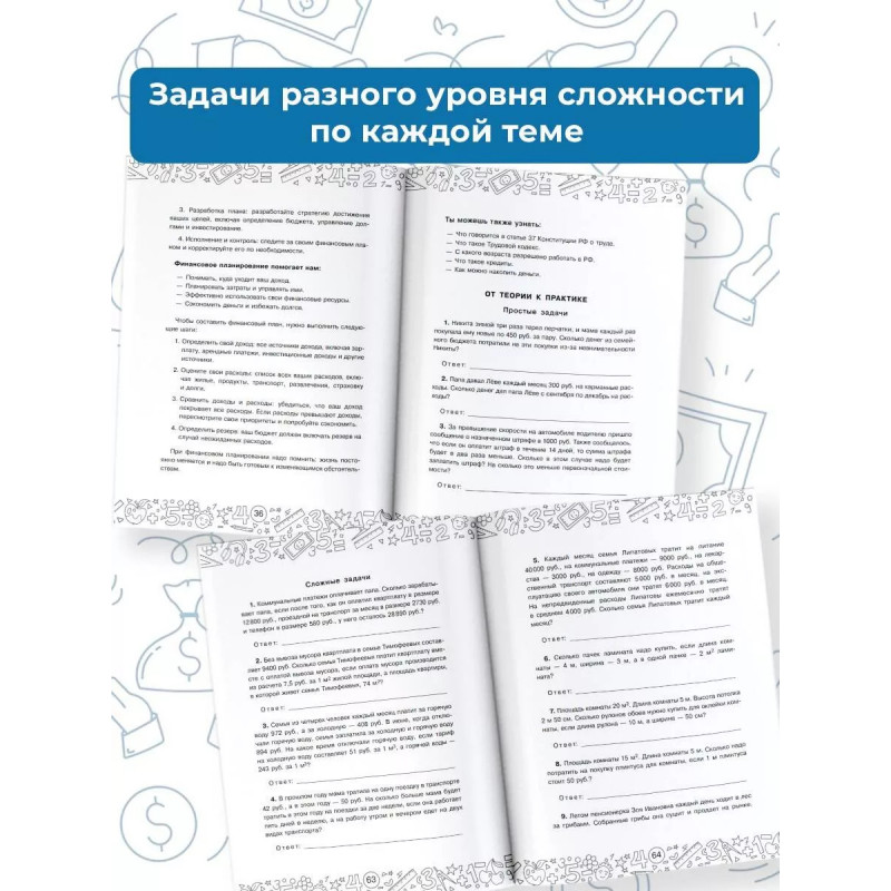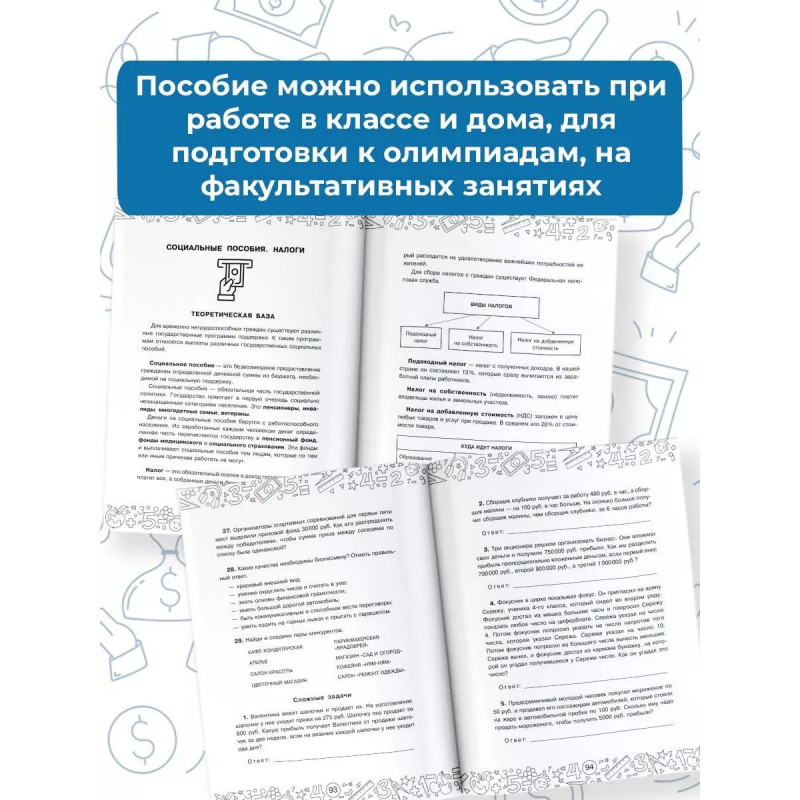 В пособии представлен теоретический материал и задачи разного уровня сложности на все темы курса финансовой грамотности в школе: Деньги. Денежные операции. Бюджет семьи. Источники доходов и расходы. ЖКХ. Коммунальные платежи. Социальные пособия. Налоги. Производство. Инвестиции. Акции. Скидки. Маркетинг. Реклама. Для удобства работы в конце книги даны ответы, словарь терминов, краткая историческая справка о торговле и ведении финансовых операций. Школьники познакомятся с понятием бухгалтерский баланс, с правилами составления финансового плана, научатся решать задачи с помощью графического изображения. Пособие можно использовать дома для закрепления знаний по финансовой грамотности и математике, а также в школе для подготовки к олимпиадам, факультативным занятиям.
