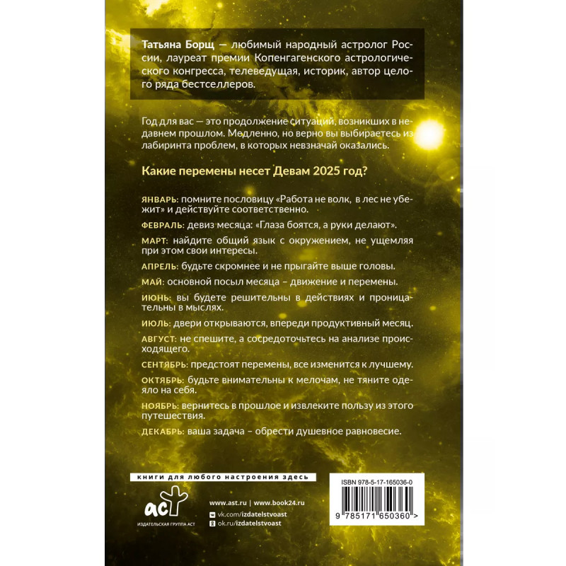 Татьяна Борщ самый популярный и уважаемый астролог России, лауреат премии Копенгагенского астрологического конгресса, телеведущая, историк, автор целого ряда бестселлеров. 2025 год для вас это продолжение ситуаций, возникших в недавнем прошлом. Медленно, но верно вы выбираетесь из лабиринта проблем, в которых невзначай оказались.