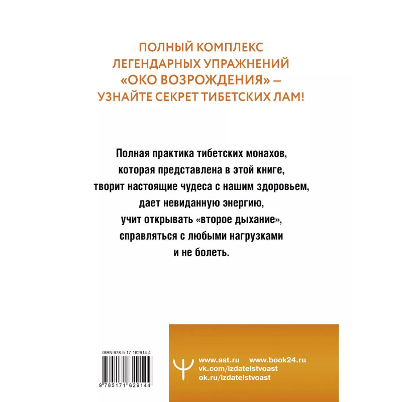 Петр Левин написал уникальное руководство по древней практике тибетских монахов, направленной на достижение долголетия и здоровья. Он раскрывает семь упражнений легендарного комплекса "Око Возрождения", которые помогут обрести энергию, силу и гармонию. Из этой книги вы узнаете, что нужно делать, чтобы: продлить молодость; научиться работать с энергией; быть всегда полным сил; излечить недуги; управлять своей судьбой через связь сознания и тела; стать неуязвимым; научиться быть в гармонии с Вселенной и многое другое. Начните путешествие в мир внутреннего совершенствования и заботы о своем благополучии и откройте новые возможности для жизни в согласии с собой и окружающим миром.