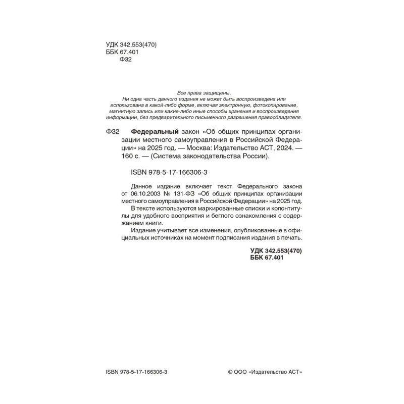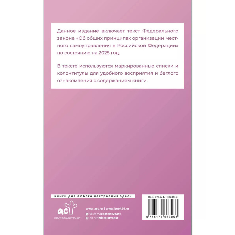 Данное издание включает текст Федерального закона "Об общих принципах организации местного самоуправления в Российской Федерации" на 2025 год. В тексте используются маркированные списки и колонтитулы для удобного восприятия и беглого ознакомления с содержанием книги. Издание учитывает все изменения, опубликованные в официальных источниках на момент подписания издания в печать.