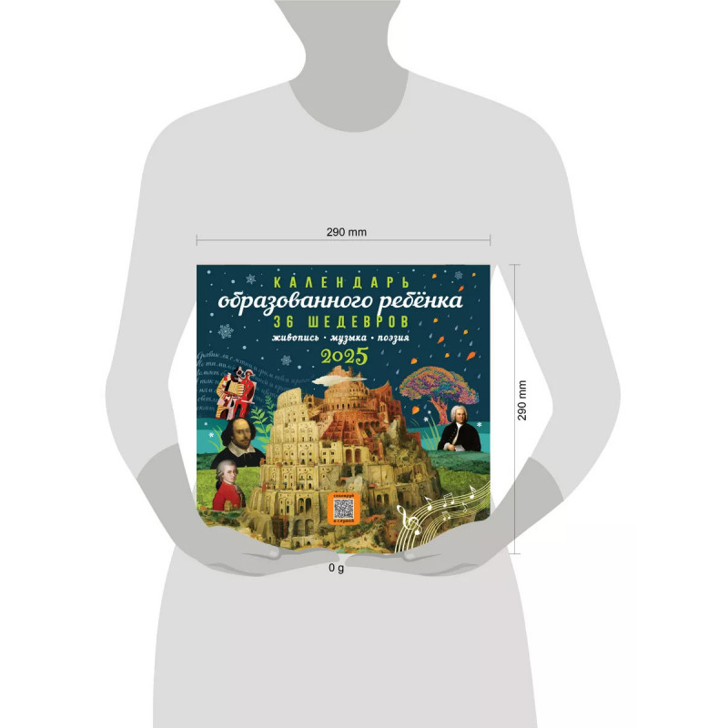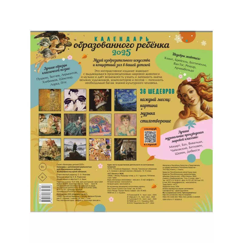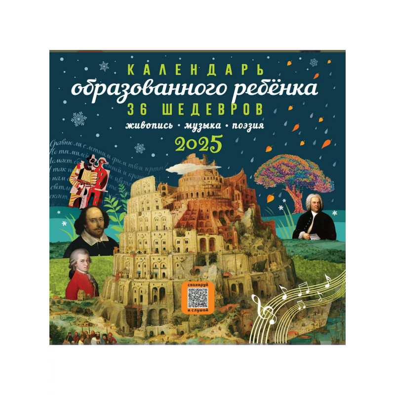 Быть культурным и образованным модно! С календарем образованного ребенка ваш сын или дочка за год пополнят необходимый багаж знаний культурного человека. Легко и с удовольствием они узнают и запомнят 36 имен великих художников, композиторов и поэтов. Познакомятся с лучшие образцами классической поэзии, музыкальными произведениями по QR-кодам, шедеврами живописи от романтизма до сюрреализма и пуантилизма! Каждый месяц новая картина, музыка, стихотворение. Пушкин, Тютчев, Лермонтов, Хлебников, Шекспир, Лорка, Гёте. Климт, Брейгель, Боттичелли, Ван Гог, Ренуар, Арчимбольдо, Моцарт, Бах, Вивальди, Чайковский, Бетховен, Шопен, Дебюсси... Календарь образованного ребенка музей изобразительного искусства и концертный зал в вашей детской.