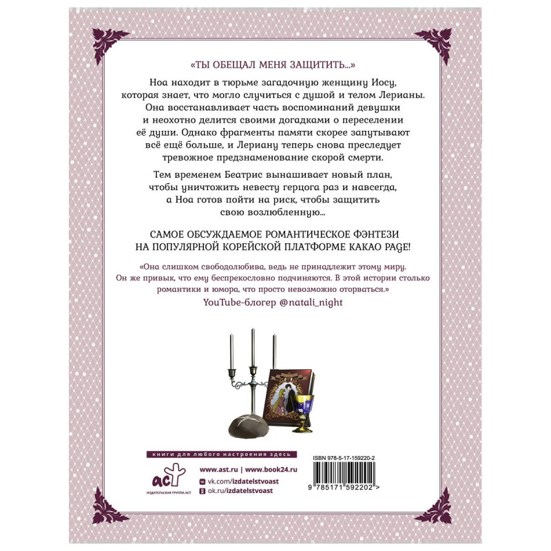 Долгожданный восьмой том фэнтезийного вебтуна, который стал самым обсуждаемым в своем жанре на корейской платформе Kakao Page! Для любителей нежных романтических историй, попаданцев и бесконечно привлекательных герцогов. Понравится поклонникам манхв Единственный конец злодейки смерть, Аделаида, Я стала матерью главного героя и Брошенная императрица. Знакомство с загадочной Иосой должно было помочь раскрыть тайну Лерианы. Пусть и неохотно, но женщина восстанавливает часть ее воспоминаний и предполагает, что же произошло с телом и душой. Но вместо прояснения все перепуталось еще больше, и Лериана чувствует надвигающуюся погибель. На поле битвы снова рвется Беатрис, которая желает окончательно уничтожить невесту герцога, но Ноа готов на все ради спасения любимой.