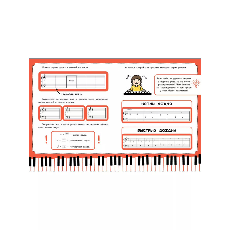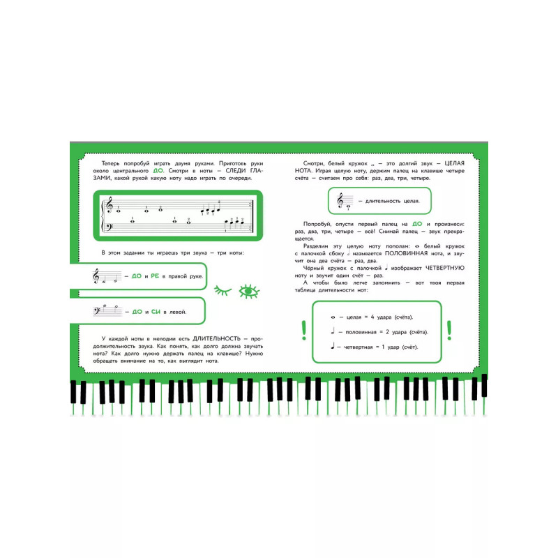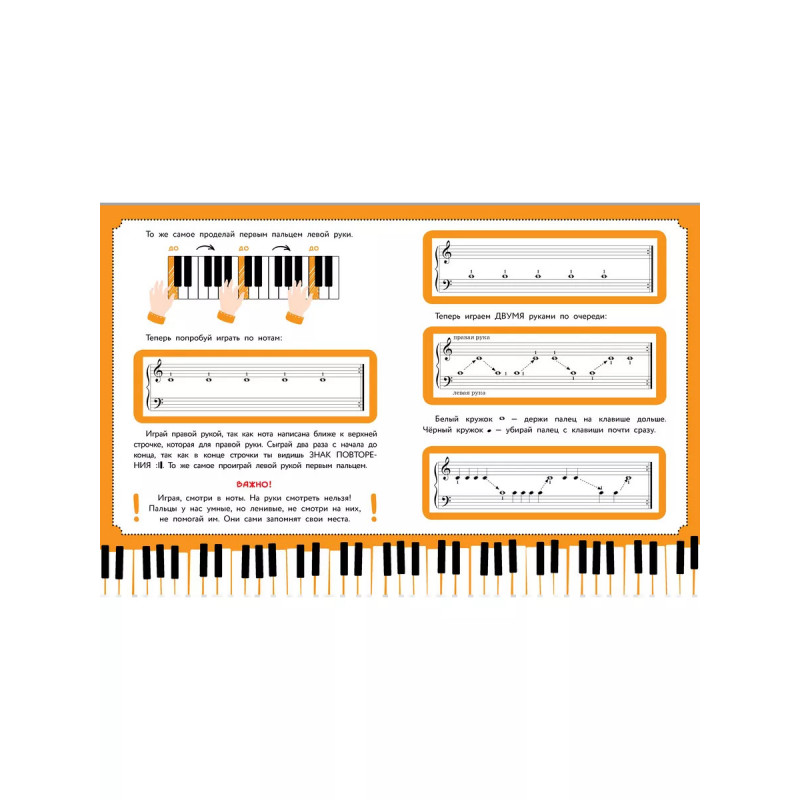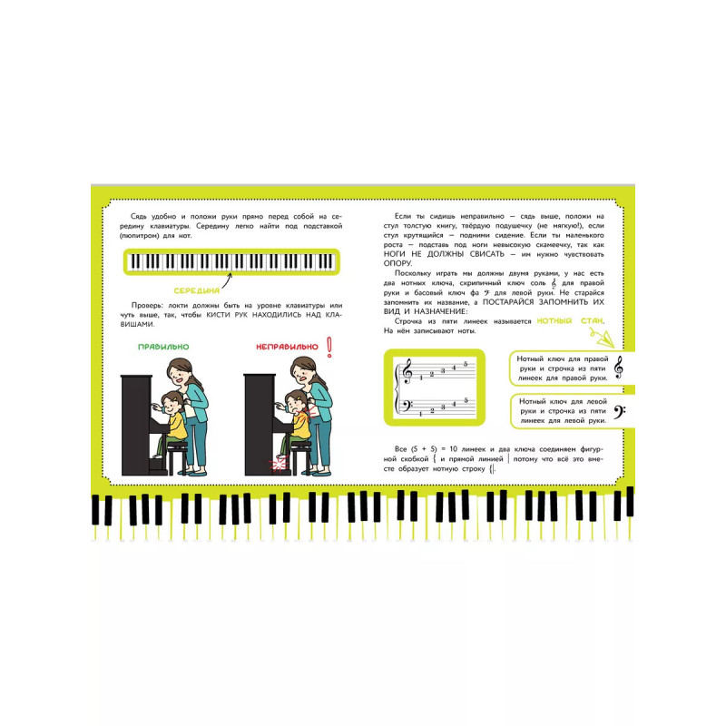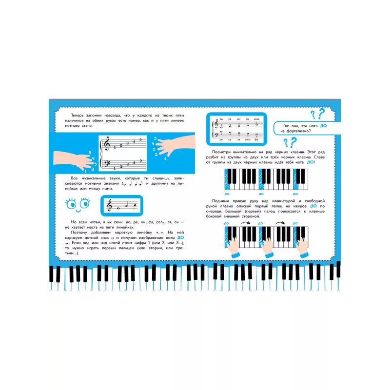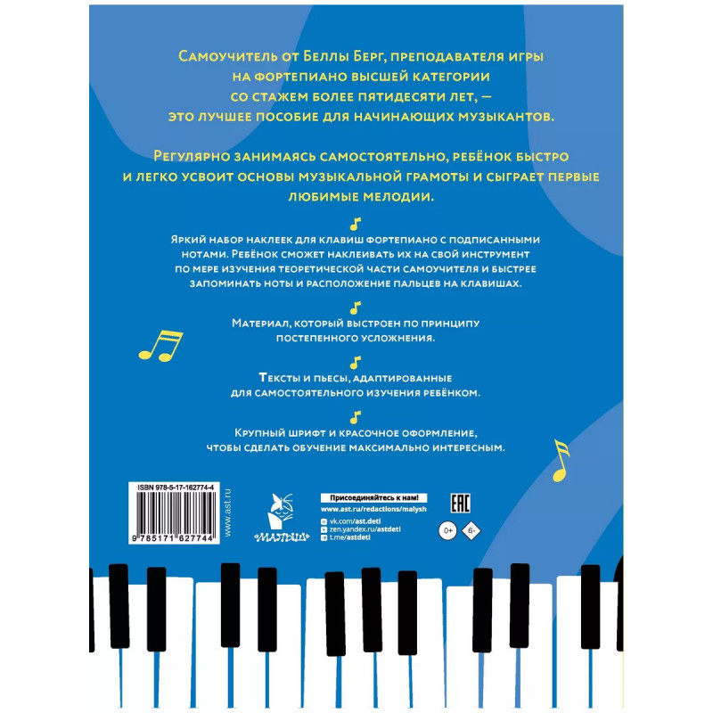 Самоучитель от Беллы Берг, преподавателя игры на фортепиано высшей категории со стажем более пятидесяти лет, это лучшее пособие для начинающих музыкантов. Регулярно занимаясь самостоятельно, ребёнок быстро и легко усвоит основы музыкальной грамоты и сыграет первые любимые мелодии. Яркий набор наклеек для клавиш фортепиано с подписанными нотами. Ребёнок сможет наклеивать их на свой инструмент по мере изучения теоретической части самоучителя и быстрее запоминать ноты и расположение пальцев на клавишах. Материал, который выстроен по принципу постепенного усложнения. Тексты и пьесы, адаптированные для самостоятельного изучения ребёнком. Крупный шрифт и красочное оформление, чтобы сделать обучение максимально интересным.