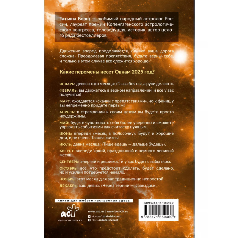 Татьяна Борщ любимый народный астролог России, лауреат премии Копенгагенского астрологического конгресса, телеведущая, историк, автор целого ряда бестселлеров. Движение вперед продолжается, однако ваша дорога сложна. Преодолевая препятствия, будьте верны себе и только в этом случае все сложится хорошо. Какие перемены несет Овнам 2025 год?
