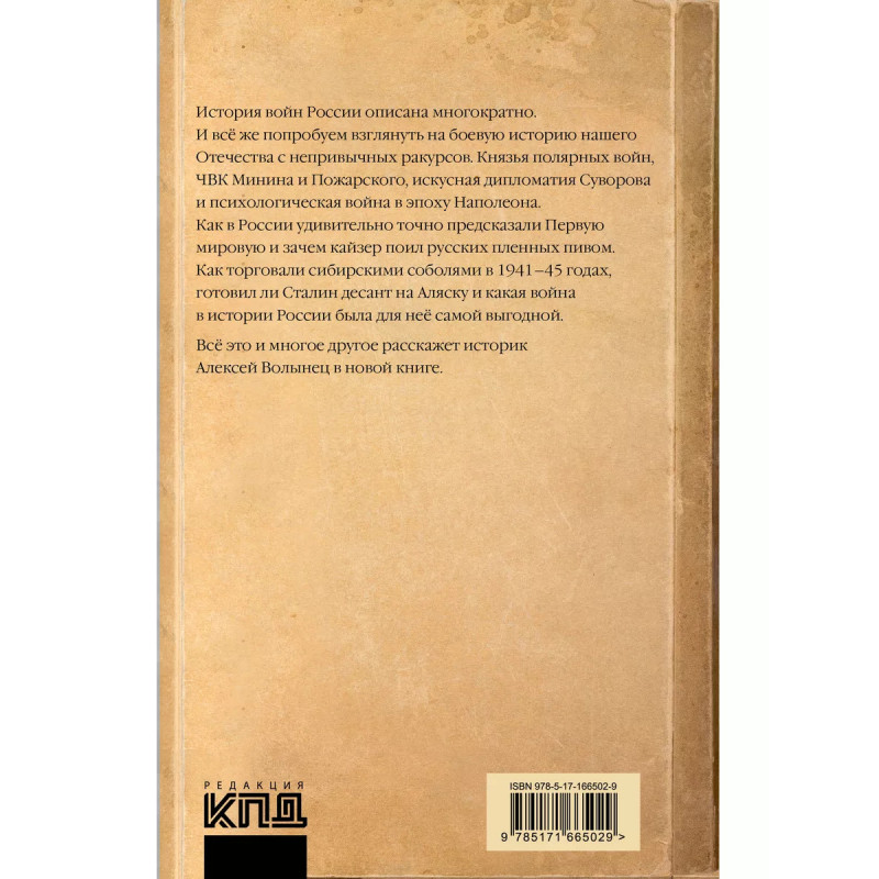 История войн России описана многократно. И всё же попробуем взглянуть на боевую историю нашего Отечества с непривычных ракурсов. Князья полярных войн, ЧВК Минина и Пожарского, искусная дипломатия Суво- рова и психологическая война в эпоху Наполеона. Как в России удивительно точно предсказали Первую миро- вую и зачем кайзер поил русских пленных пивом. Как тор- говали сибирскими соболями в 19411945 годах, готовил ли Сталин десант на Аляску и какая война в истории Рос- сии была для неё самой выгодной. Всё это и много другое расскажет историк Алексей Волынец в новой книге.