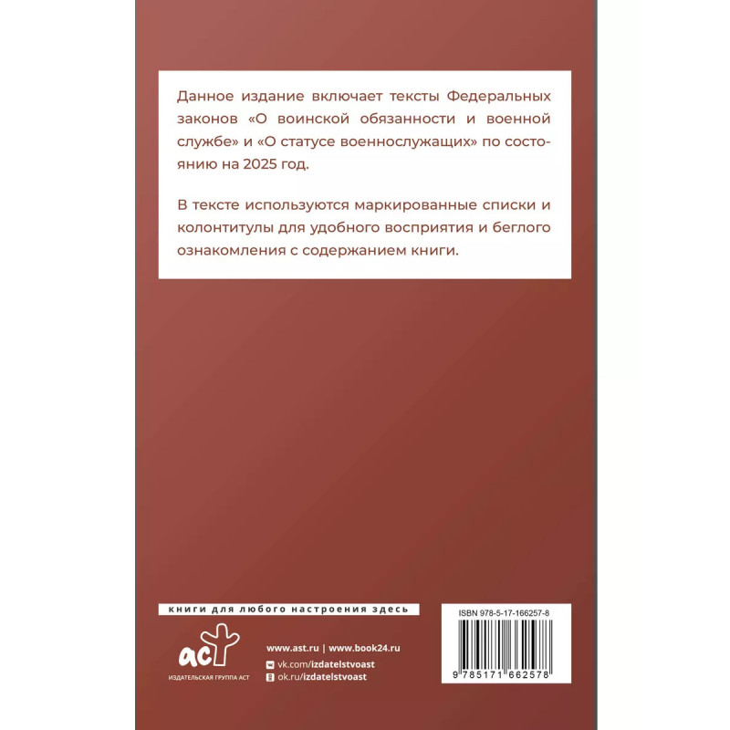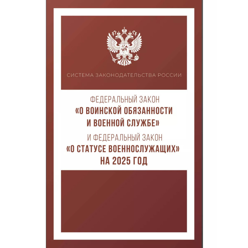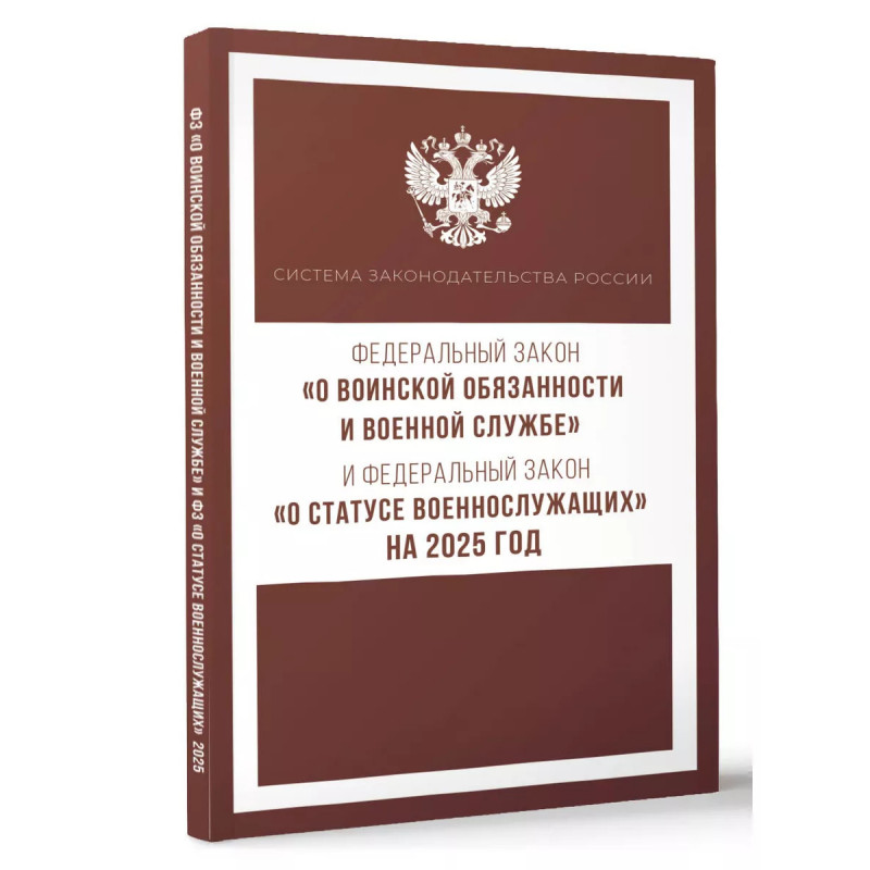 Данное издание включает тексты Федеральных законов "О воинской обязанности и военной службе" и "О статусе военнослужащих" на 2025 год. В тексте используются маркированные списки и колонтитулы для удобного восприятия и беглого ознакомления с содержанием книги. Издание учитывает все изменения, опубликованные в официальных источниках на момент подписания издания в печать.