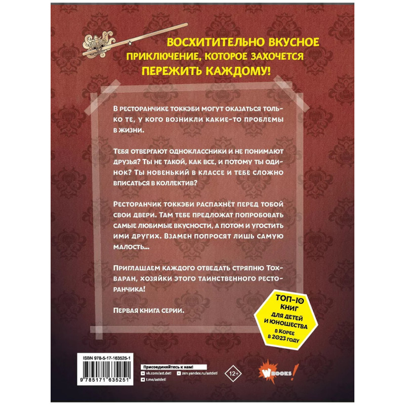 Восхитительно вкусное приключение, которое захочется пережить каждому! В "Ресторанчике токкэби" могут оказаться только те, у кого возникли какие-то проблемы в жизни. Тебя отвергают одноклассники и не понимают друзья? Ты не такой как все и потому ты одинок? Ты новенький в классе и тебе сложно вписаться в коллектив? "Ресторанчик токкэби" распахнёт перед тобой свои двери. Там тебе предложат попробовать самые любимые вкусности, а потом и угостить ими других. Взамен попросят лишь самую малость Приглашаем каждого отведать стряпню Тохваран, хозяйки этого таинственного ресторанчика! Первая книга серии.