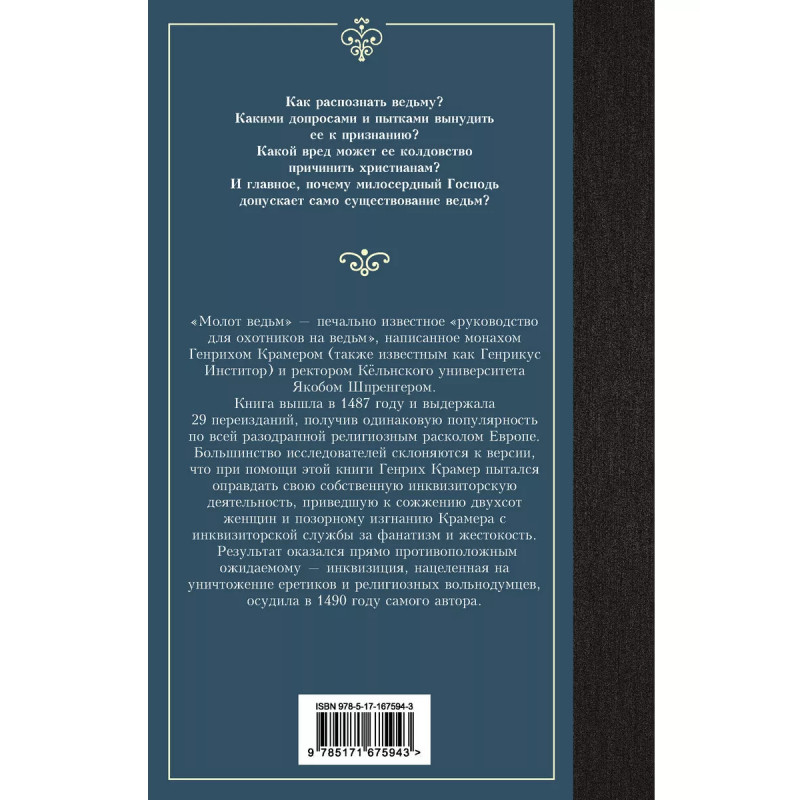 "Молот ведьм" печально известное "руководство для охотников на ведьм", написанное монахом Генрихом Крамером (также известным как Генрикус Инститор) и ректором Кёльнского университета Якобом Шпренгером. Книга вышла в 1487 году и выдержала 29 переизданий, получив одинаковую популярность по всей разодранной религиозным расколом Европе. Большинство исследователей склоняются к версии, что при помощи этой книги Генрих Крамер пытался оправдать свою собственную инквизиторскую деятельность, приведшую к сожжению двухсот женщин и позорному изгнанию Крамера с инквизиторской службы за фанатизм и жестокость. Результат оказался прямо противоположным ожидаемому инквизиция, нацеленная на уничтожение еретиков и религиозных вольнодумцев, осудила в 1490 году самого автора.