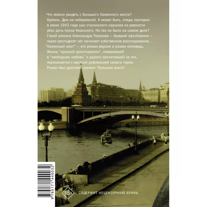Каменный мост. Александр Терехов - автор романов "Немцы" (премия "Национальный бестселлер"), "Мемуары срочной службы", "Крысобой", "Бабаев". Бестселлер "Каменный мост" вызвал бурную полемику в обществе вскоре после выхода, был удостоен премии "Большая книга" и вошёл в шорт-лист премии "Русский Букер", а также был переведен на английский и итальянский языки. Что можно увидеть с Большого Каменного моста? Кремль. Дом на набережной. А может быть, следы трагедии: в июне 1943 года сын сталинского наркома из ревности убил дочь посла Уманского. Но так ли было на самом деле? Герой романа Александра Терехова - бывший эфэсбэшник - через шестьдесят лет начинает собственное расследование "Каменный мост" - это роман-версия и роман-исповедь. Жизнь "красной аристократии", поверившей в "свободную любовь" и дорого заплатившей за это, пересекается с жесткой рефлексией самого героя.