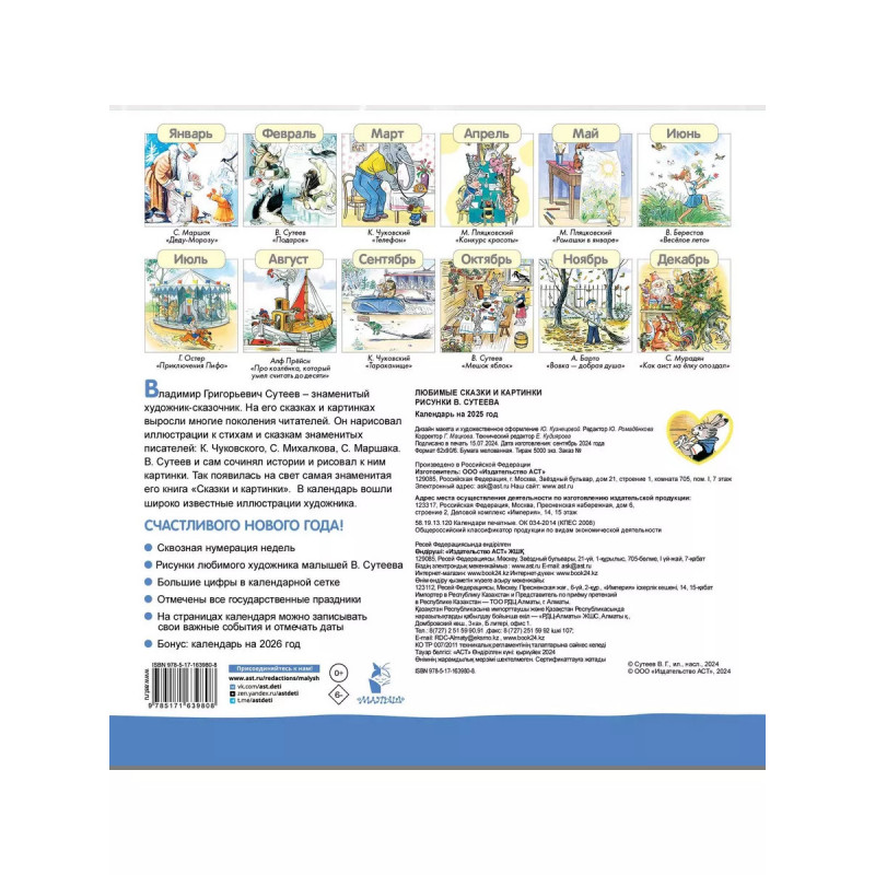 Владимир Григорьевич Сутеев знаменитый художник-сказочник. На его сказках и картинках выросли многие поколения читателей. Он нарисовал иллюстрации к стихам и сказкам знаменитых писателей: К. Чуковского, С. Михалкова, С. Маршака. В. Сутеев и сам сочинял истории и рисовал к ним картинки. Так появилась на свет самая знаменитая его книга Сказки и картинки. В календарь вошли широко известные иллюстрации художника. В календаре: Сквозная нумерация недель Большие цифры в календарной сетке Отмечены все государственные праздники Можно записывать свои важные события и даты Самые знаменитые сказки в картинках В. Сутеева Лучший подарок каждому малышу Бонус: календарь на 2026 год