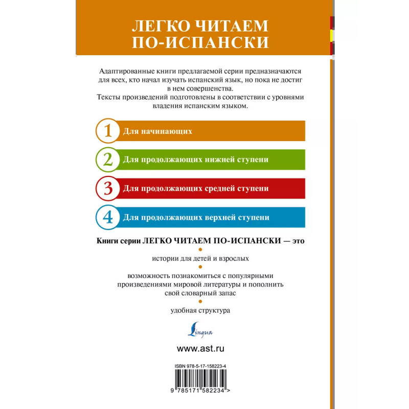 Хитроумный идальго Дон Кихот Ламанчский. Уровень 1 Don Quijote de la Mancha. "Хитроумный идальго Дон Кихот Ламанчский" - знаменитый роман испанского писателя Мигеля де Сервантеса о разорившемся дворянине Дон Кихоте, возомнившем себя странствующим рыцарем, который отправляется в захватывающее путешествие вместе со своим верным оруженосцем Санчо Пансой. Теперь яркую сатиру, полную юмора, сюрпризов и приключений, могут прочитать даже те, кто только начал изучение испанского языка! Текст книги сокращён, адаптирован и сопровождается комментариями и упражнениями с ответами. Также в конце книги вы найдёте небольшой испанско-русский словарь, который поможет вам с выполнением заданий. Пособие предназначается для начинающих изучать испанский язык (уровень 1 - для начинающих А1-А2). Небольшой формат издания позволяет читать произведение как дома, так и в поездке.