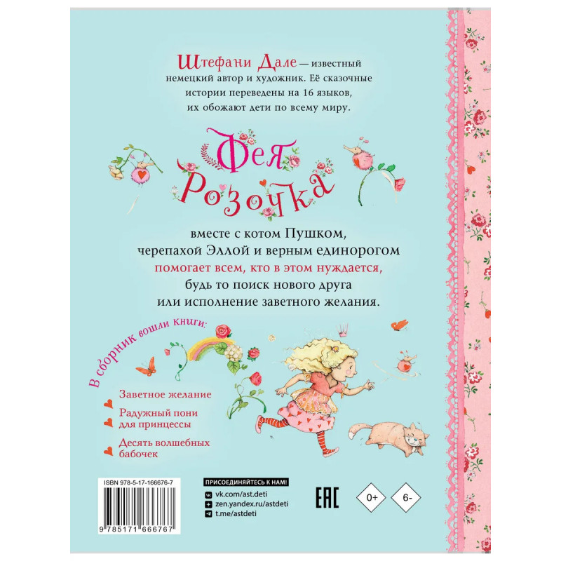 Сказочная принцесса фея Розочка живёт в замке и умеет исполнять самые заветные желания. Ей на помощь всегда приходят верные друзья: кот Пушок, черепаха Элла и белоснежный единорог. Вместе они отправятся на поиски подарка для принцессы Сисси и отыщут друга для маленькой шоколадной белочки. В сборник вошли истории "Фея Розочка. Заветное желание", "Фея Розочка. Радужный пони для принцессы", "Фея Розочка. Десять волшебных бабочек".