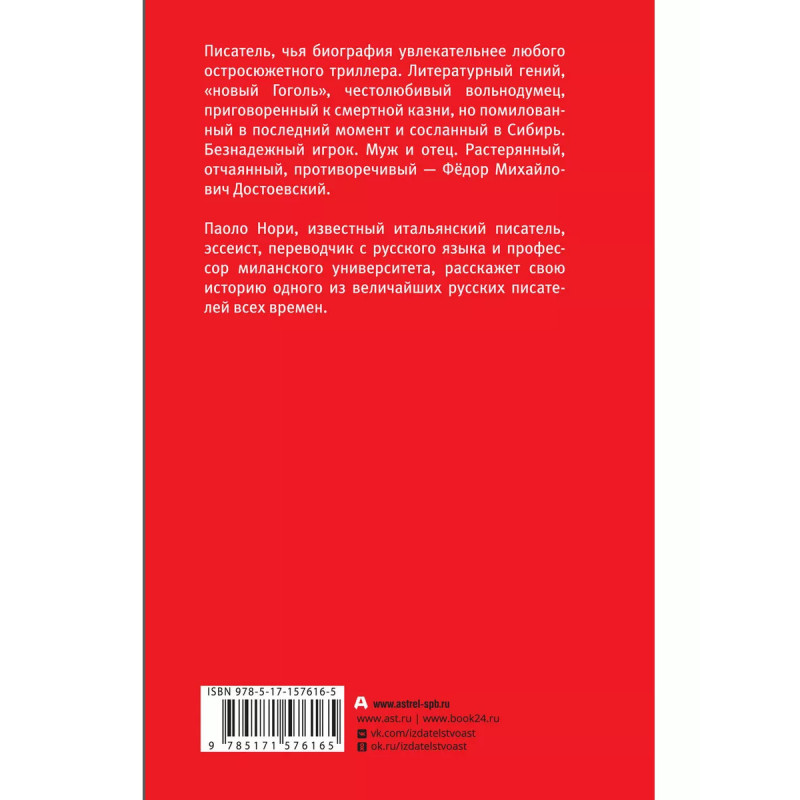 Известный итальянский автор, лектор и переводчик Паоло Нори впервые открыл для себя Достоевского в пятнадцать лет, и с тех пор его жизнь оказалась неразрывно связана с русской литературой. Он переводил на итальянский язык произведения Пушкина, Булгакова и Стругацких, выступал по всей Италии с лекциями о Достоевском, а его книги добирались до первых строчек в рейтингах бестселлеров. Невероятная жизнь Фёдора Михайловича Достоевского первая книга Нори, выпущенная в России. Это история невероятно насыщенной и увлекательной жизни великого русского писателя, который пережил тюрьму, каторгу и пристрастие к азартным играм, который едва не был направлен на эшафот, но в последний момент получил помилование, который создал одни из самых величайших произведений, когда-либо написанных на русском языке.