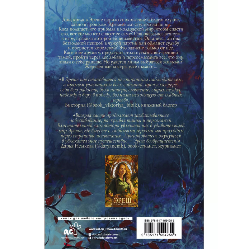 Продолжение фэнтези-трилогии звезды молодежного фэнтези Ланы Клонис, начатой в Книге странствий. Новые приключений Каси и ее друзей в удивительном волшебном мире Эреш. Понравится поклонникам героического и эпического Young Adult фэнтези с несколькими сюжетными линиями, а также тем, кто уже прочитал истории Клуб Рейвен, Реннвинд и Светлолесье. Блистательный слог, чарующая атмосфера, увлекательный сюжет и герои, в которых невозможно не влюбиться. В Книге огня читателей ждет еще больше тайн и страшных испытаний, борьба за власть, сложные решения и яркие эмоции. Серия Звезды молодежного фэнтези только лучшие фэнтезийные романы отечественных авторов в стильном оформлении! Атмосферные иллюстрации с героями внутри.