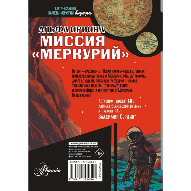 Альфа Ориона яркая красноватая звезда в созвездии Ориона. Она подарила свое имя космическому кораблю, который унесет в космическое путешествие обычного российского школьника Мишку Сорокина... Отправляясь вместе с ним, не забудьте захватить с собой карту Меркурия, самую что ни на есть настоящую, составленную профессиональными астрономами. Мы вложили ее в книгу. Она поможет вам в необычном путешествии на одну из самых малоизученных планет Солнечной системы. Для среднего и старшего школьного возраста.