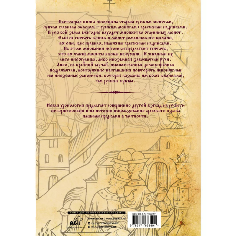 - Монументальное исследование русских монет разных веков с арабскими надписями. - Книга обильно иллюстрирована фотографиями с подробными расшифровками куфических надписей. На их основе авторы делают выводы о реальной эпохе происхождения монет, которые кардинально отличаются от принятых историками! - От ученых-математиков и экспертов по применению новых эмпирико-статистических методов к анализу исторических летописей и памятников. - Must read для всех, кто обожает средневековую историю и интересуется истинной ролью Руси в главных мировых событиях. - Золотая серия новые исторические гипотезы и теории в рамках Новой хронологии, основанные на последних научных данных.