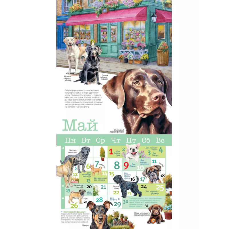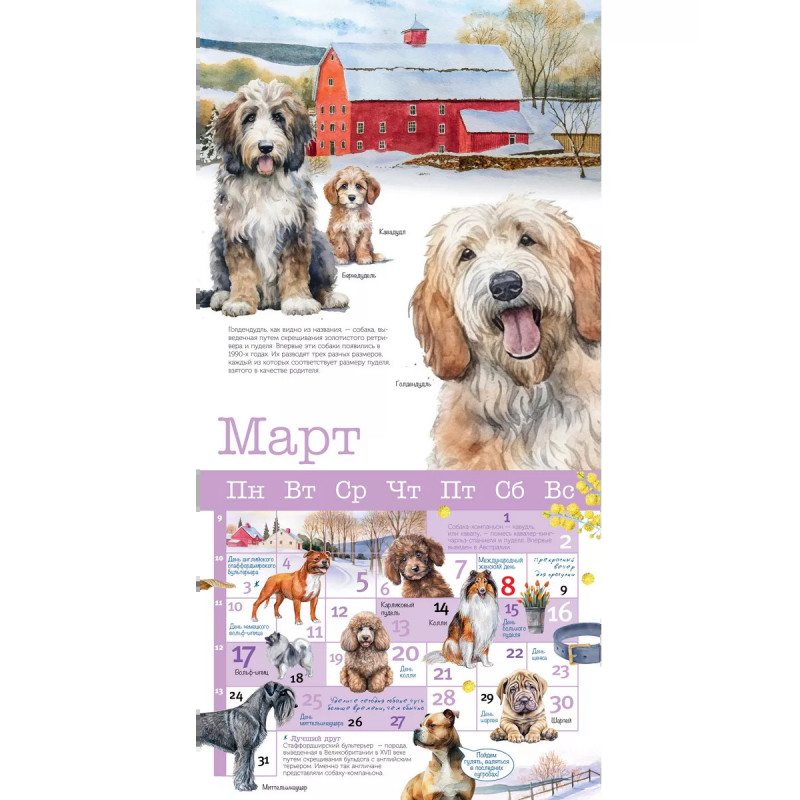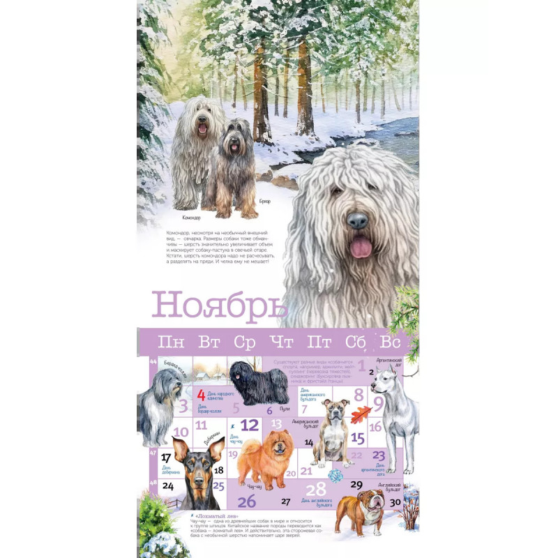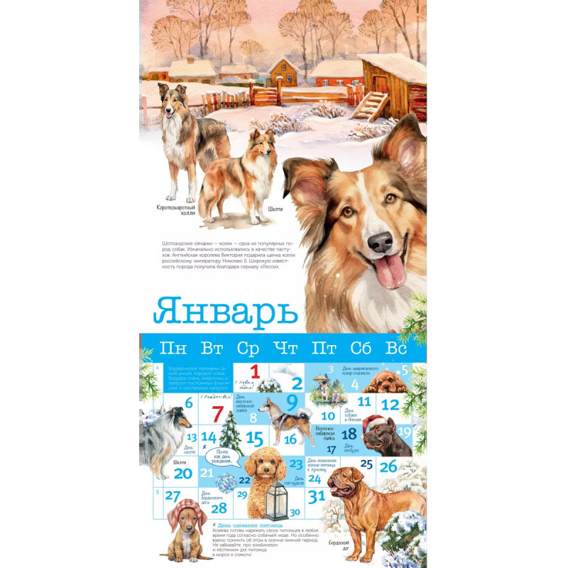 В календарь включены российские и международные праздники, связанные с собаками, день рождение каждой породы, а также забавные праздники, придуманные любителями собак в разных странах мира. Любопытная информация о породах, рассказы о собаках, будут интересны как детям, так и взрослым. Замечательные иллюстрации художников-анималистов украшают каждый календарный месяц, представляя самые разные породы, щенков и взрослых собак.