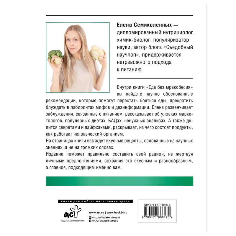 Елена Семиколенных дипломированный нутрициолог, химик-биолог, популяризатор науки, автор блога "Съедобный научпоп", придерживается нетревожного подхода к питанию. Внутри книги "Еда без мракобесия" вы найдете научно обоснованные рекомендации, которые помогут перестать бояться еды, прекратить блуждать в лабиринтах мифов и дезинформации. Елена развенчивает заблуждения, связанные с питанием, рассказывает об уловках маркетологов, популярных диетах, БАДах, ненужных анализах. А также делится секретами и лайфхаками, раскрывает, из чего состоят продукты, как работает человеческий организм. На страницах книги вас ждут вкусные рецепты, основанные на научных знаниях, а не на громких словах. Издание поможет правильно составить свой рацион, не жертвуя личными предпочтениями, сохраняя его вкусным и разнообразным, а главное, подходящим именно вам.