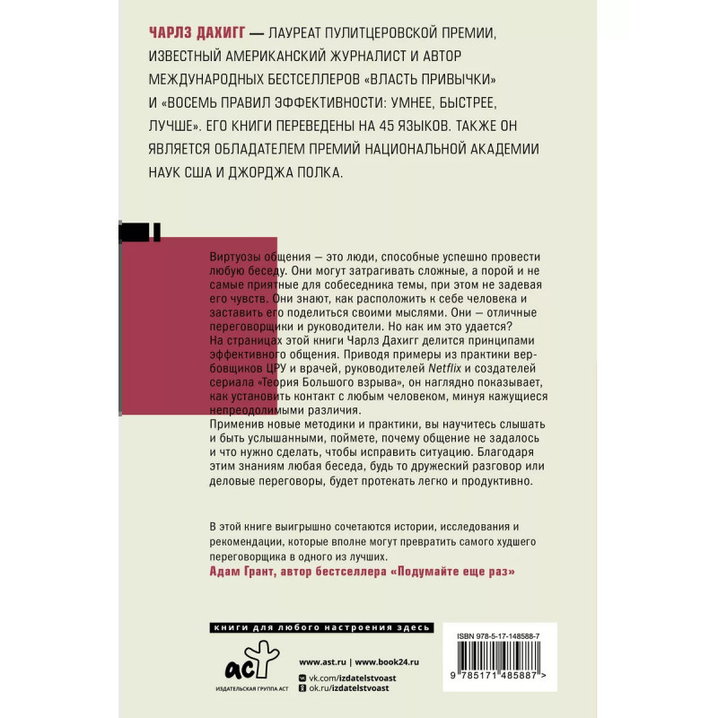 От автора бестселлера Сила привычки. Почему мы живем и работаем именно так, а не иначе. Увлекательное исследование принципов эффективной коммуникации. Содержит практические советы как стать виртуозом общения. Из этой книги вы узнаете: Как услышать собеседника и быть услышанным. Как расположить к себе человека и заставить поделиться своими мыслями. Как наладить любую беседу. Как понять, почему общение не задалось, и как это исправить.