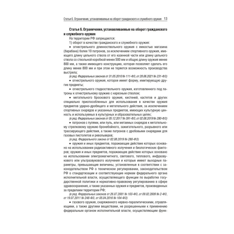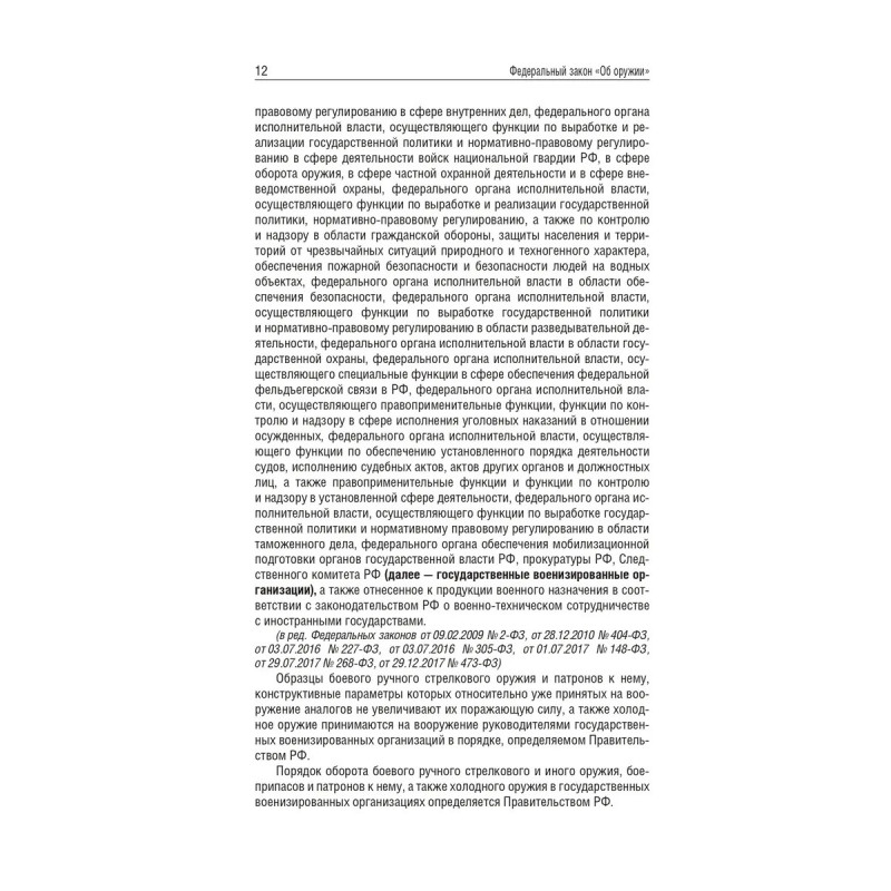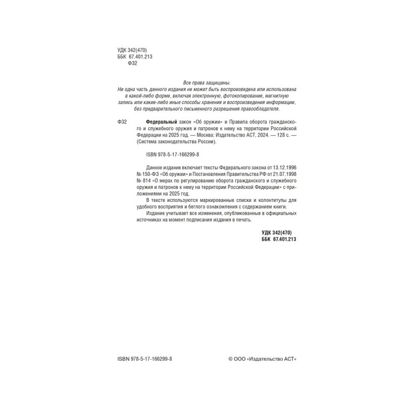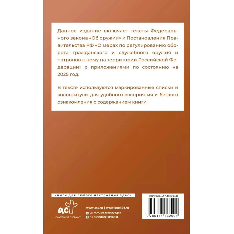 Данное издание включает тексты Федерального закона "Об оружии" и Постановления Правительства РФ "О мерах по регулированию оборота гражданского и служебного оружия и патронов к нему на территории Российской Федерации" с приложениями на 2025 год. В тексте используются маркированные списки и колонтитулы для удобного восприятия и беглого ознакомления с содержанием книги. Издание учитывает все изменения, опубликованные в официальных источниках на момент подписания издания в печать.