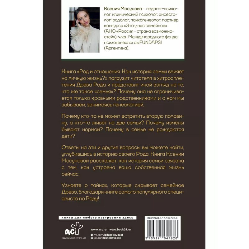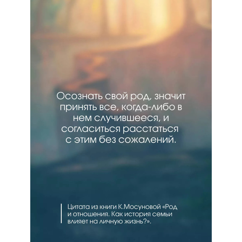 В чем современная женщина может найти опору для создания крепкой семьи или успешной карьеры? В книге Род и отношения клинический психолог, родолог Ксения Мосунова рассказывает о том, как любая женщина (и мужчина!) может найти опору, наладив внутренние связи в роду, опираясь на его историю. Благодаря книге вы узнаете, как менялось отношение к семье и браку с течением времени, как история семьи влияет на нашу личную жизнь, почему часто мы выбираем не тех партнеров, почему в вашей судьбе повторяются родовые сценарии и почему не получается выйти замуж и родить детей? Благодаря книге Ксении Мосуновой, вы не только разберетесь в своей родословной, но и сможете составить генеалогическое древо при помощи геносоциограммы. Книга Род и отношения поможет разобраться в хитросплетении семейных связей и навести в них порядок, сохранить семью и бизнес, и даже поправить здоровье через проработку отношений с родителями и предками. Вы сможете взглянуть на свою жизнь иначе - через историю вашей семьи и рода.