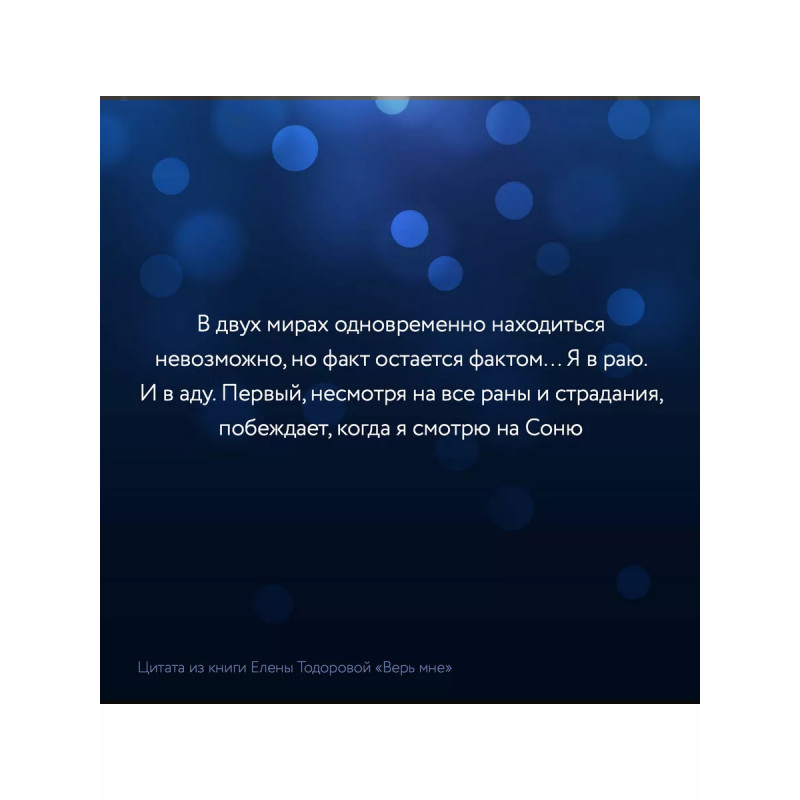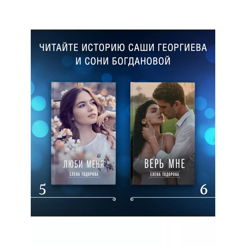Верь мне. Есть ли у любви второй шанс? Кажется, что попытка будет обречена, ведь между Сашей и Соней все кончено навсегда. Мать Саши выбрала для любимого сына более выгодную партию, и Саша вполне счастлив. Может быть, стоит забыть о коварном возлюбленном и любимом городе навсегда? Но Соня делает шаг навстречу своему страху: ей предстоит столкнуться с теми, кто принес ей так много горя. Она снова встретится с Сашей и его семьей, которые сделали все, чтобы разлучить влюбленных. Чем все это закончится? И почему судьба сталкивает бывших влюбленных снова и снова? С остросюжетным любовным романом Елены Тодоровой "Верь мне" вас ждет ураган страстей и чувства, крушащие все на своем пути. Отвлекитесь от повседневных забот и отправляйтесь в увлекательное любовное путешествие! В новом любовном романе Елены Тодоровой с первых страниц вас ждут страсти, интриги и эмоции, искрящие и опасные, как провода под высоким напряжением. Узнайте, чем закончится история влюбленных, начавшаяся в романе "Люби меня".