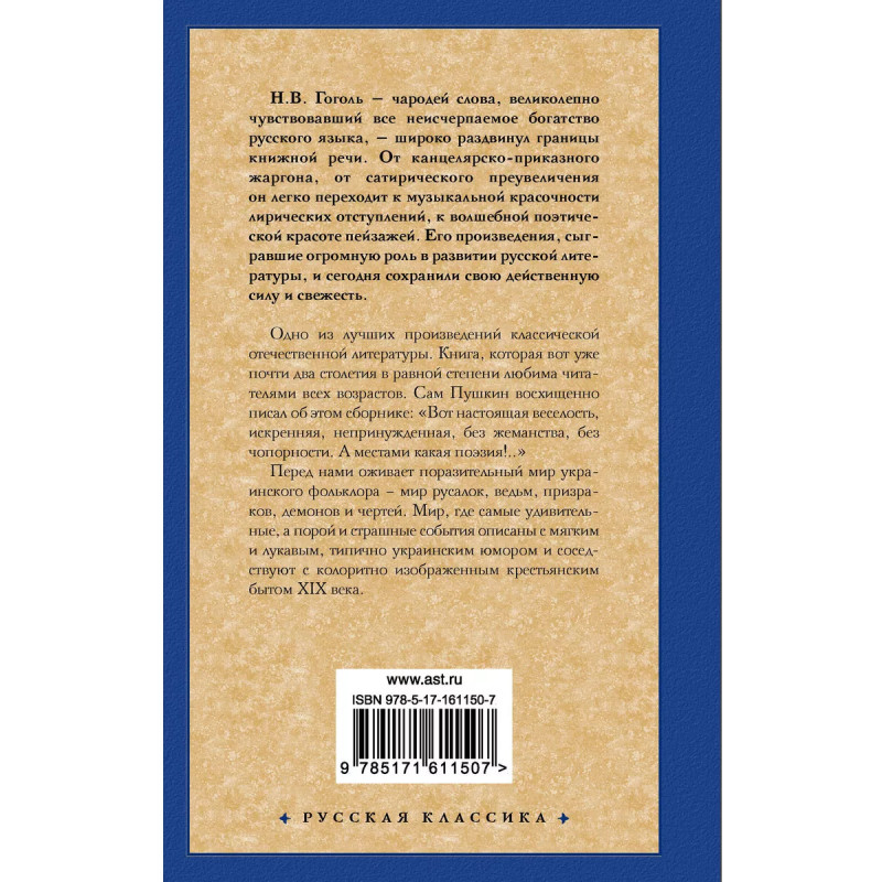 Вечера на хуторе близ Диканьки. Одно из лучших произведений классической отечественной литературы. Книга, которая вот уже почти два столетия в равной степени любима читателями всех возрастов. Сам Пушкин восхищенно писал об этом сборнике: "Вот настоящая весёлость, искренняя, непринуждённая, без жеманства, без чопорности. А местами какая поэзия!.." Перед нами оживает поразительный мир украинского фольклора - мир русалок, ведьм, призраков, демонов и чертей. Мир, где самые удивительные, а порой и страшные события описаны с мягким и лукавым, типично украинским юмором и соседствуют с колоритно изображенным крестьянским бытом XIX века.